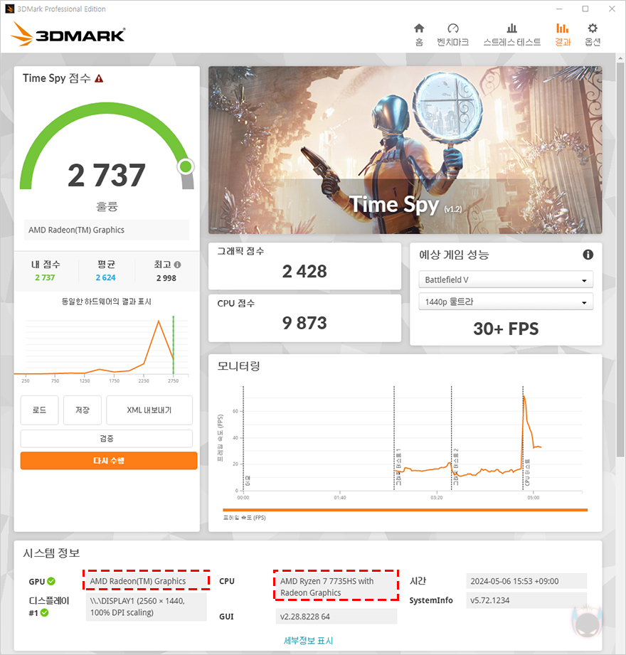 끝으로, 앞서 내장그래픽에서 언급했듯이 라이젠 7 7735HS에는 라데온 680M이, 라이젠 7 7840HS에는 라데온 780M GPU가 탑재되어 성능을 확인해 봤는데, 실제 게임 벤치마크에서는 어느 정도 차이를 보이는지도 확인해 봤습니다. 일반적으로 그동안 내장그래픽으로 게임을 한다면 해상도와 그래픽 품질에서 타협을 봐야 했는데, 라데온 780M의 성능이 꽤나 잘 나오기 때문에 QHD 해상도와 기본 게임옵션으로 비교를 해봤습니다. 비교결과, 확실히 라데온 780M 이전까지의 내장그래픽은 QHD 해상도만 높여도 상당히 성능이 떨어지는 것을 확인할 수 있는 반면, 라데온 780M은 QHD 해상도에서 성능이 낮더라도 이전 내장그래픽들보다는 확실히 높아진 것을 볼 수 있어서, 이제 게임플레이 시 타협점을 낮게 잡을 수 있고, 풀-HD 해상도에선 원활하게 플레이할 수 있음을 짐작할 수 있습니다.