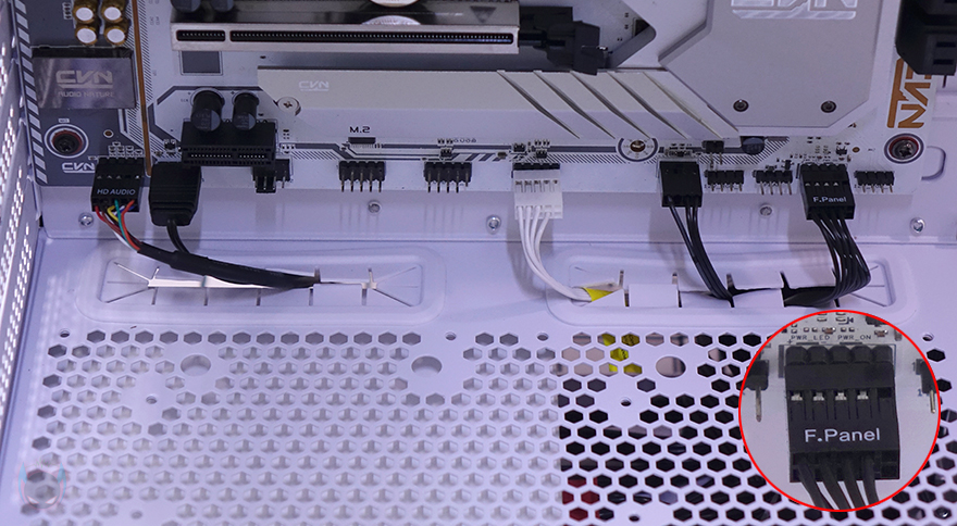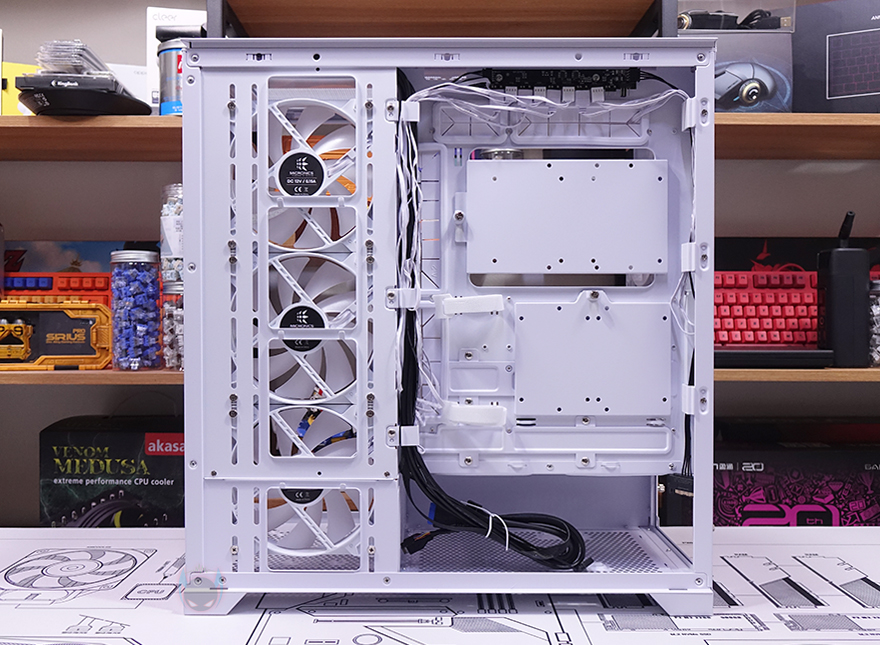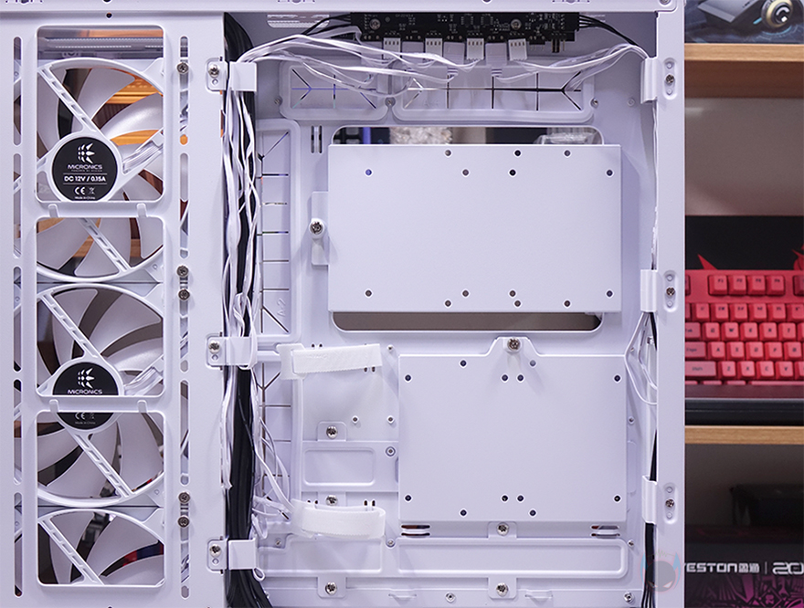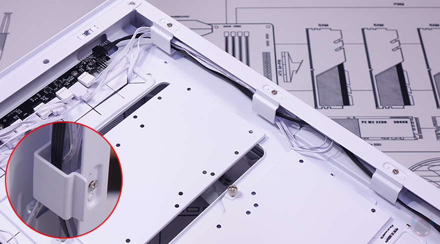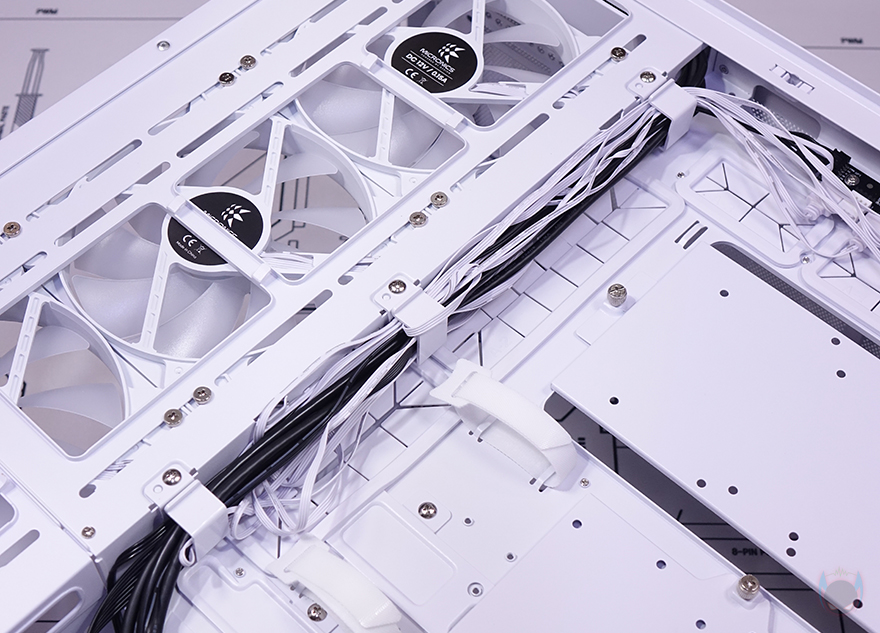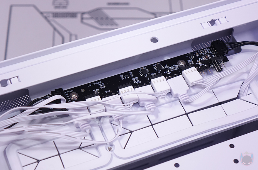 케이스 내부 뒷공간 그러니깐 메인보드 트레이 후면을 살펴보면, 측면 쿨링시스템보다 안쪽으로 들어간 상태로 선정리 공간을 확보하고 있는데, 약 30mm 공간으로 사이드패널의 공간까지 합치면 약 35mm의 선정리 공간을 확보하고 있습니다. 또한, 양쪽 공간에는 일정 간격으로 케이블을 묶어놓는 홀드 장치도 적용되어 있죠. 또한, 상단 안쪽에는 기본 제공되는 팬들을 컨트롤할 수 있는 허브가 적용되어 있는데, 팬과 ARGB 헤더 함께 갖춘 허브로 최대 5개의 팬까지 연결할 수 있습니다. 그리고, 이 허브를 통해 상단 LED 버튼을 통한 LED 모드 전환도 할 수 있죠.