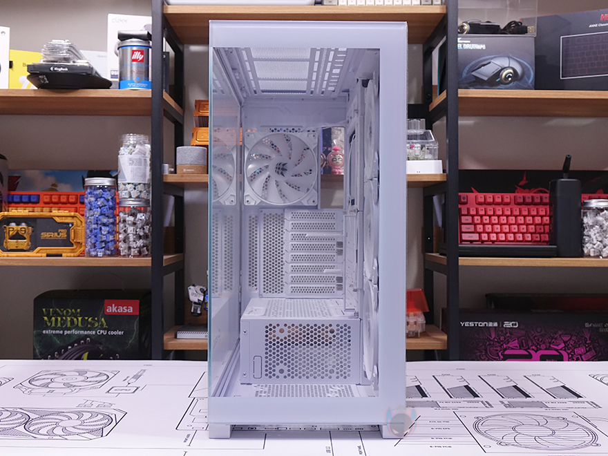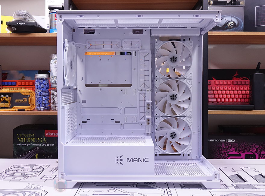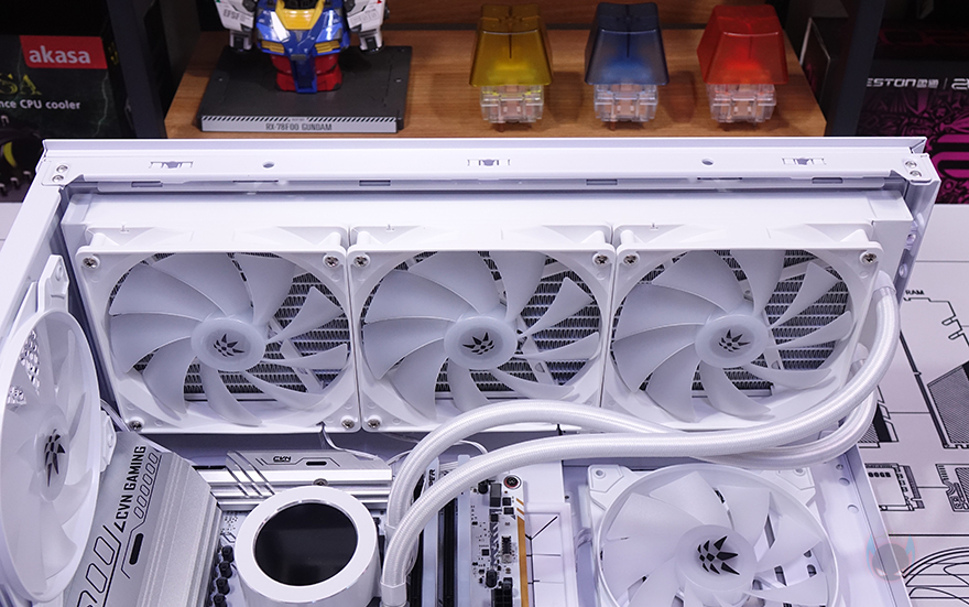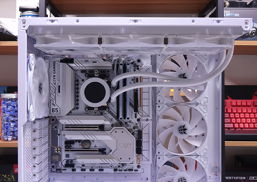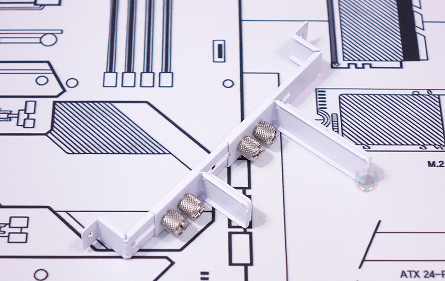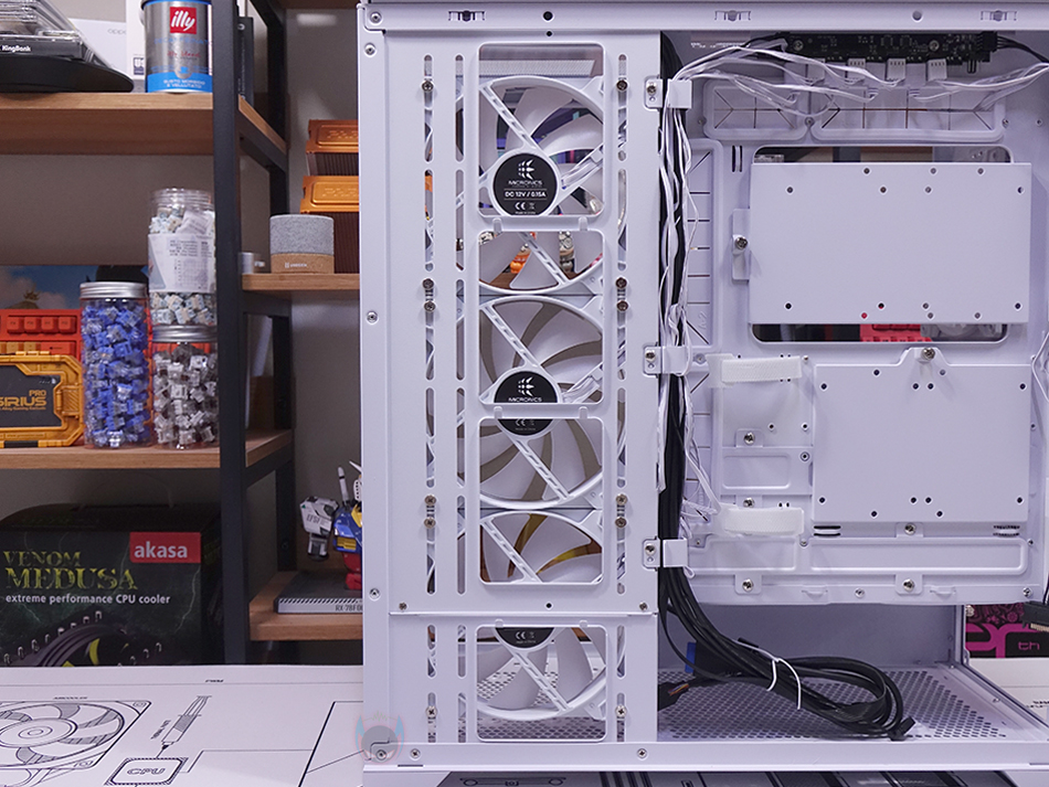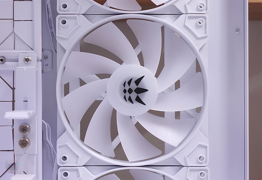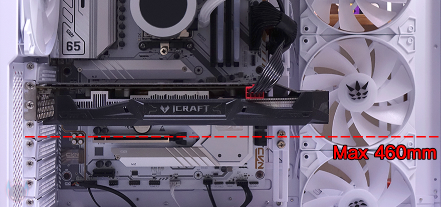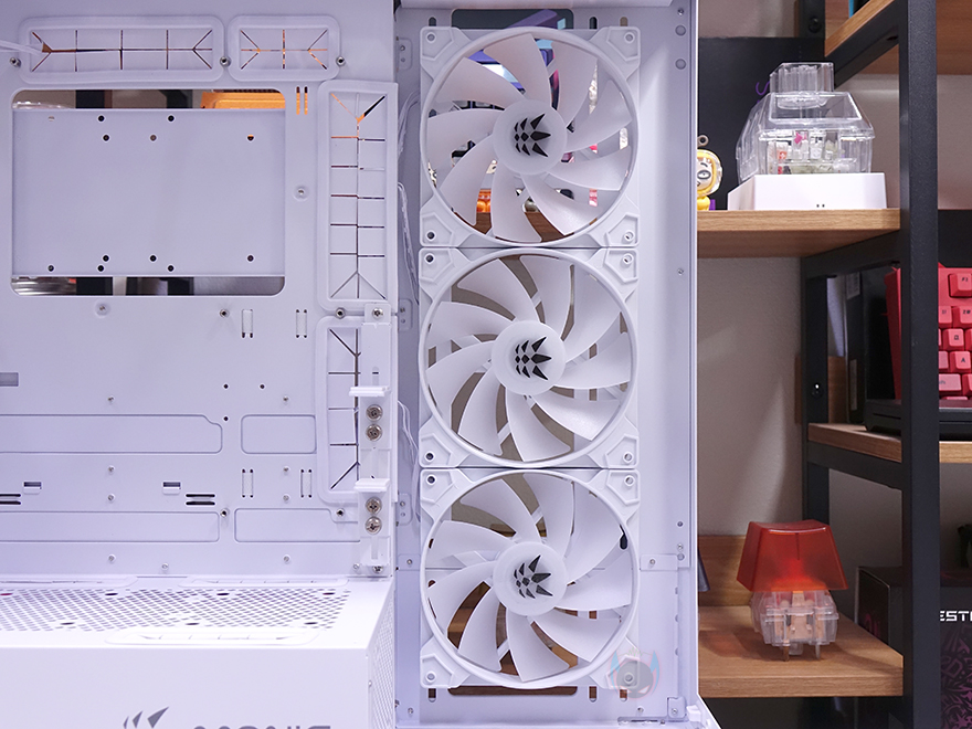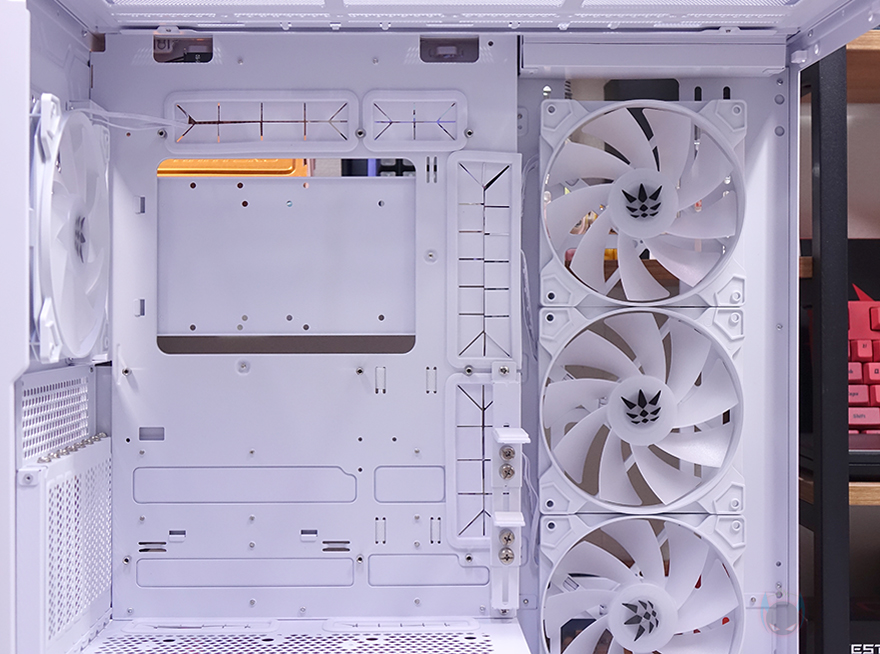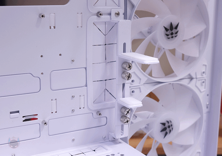 그리고, 메인보드 트레이 한쪽에는 그래픽카드 지지대도 기본 제공으로 장착되어 있는데, 케이스 색상에 맞춰 화이트 색상으로 적용했으며, 위/아래 2개의 지지대가 적용되어서 손나사로 쉽게 위치조절 및 고정할 수 있도록 했습니다. 또한, 이 지지대는 분리도 가능한데, 분리를 하면 앞서 후면 PCI슬롯을 그래픽카드 수직방향 장착으로 사용할 시, 지지대 역시 하단 파워서플라이 커버 상단에 장착해 수평방향으로 사용할 수 있습니다. 또한, 바로 옆에는 내부 측면 쿨링시스템을 갖추고 있는데, 기본 팬 140mm 3개를 장착해 제공해주고 있으며, 팬 날개가 역방향인 리버스 팬이고, RGB 팬이죠. 물론, 이 부분에도 팬을 다 제거하고 수랭 쿨러 라디에이터를 장착할 수 있으며, 최대 420mm까지 지원합니다.