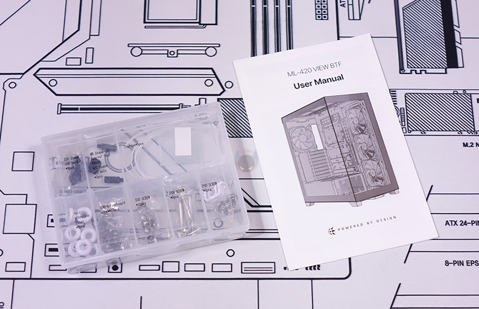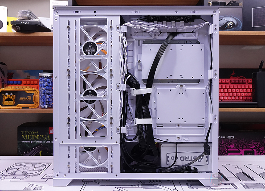 직접, 마이크로닉스 ML-420 View BTF PC케이스를 사용해 시스템 조립을 해보면, 파워서플라이 같은경우 브라켓에 먼저 장착한 후 슬라이딩 방식으로 넣어주면 되는데, 슬라이딩으로 들어가는 홀 크기가 ATX 규격에 딱 맞기 때문에 파워서플라이 제품에 따라선 스크래치가 발생할 수 있습니다. 만약 스크래치 발생이 싫다면 케이스에서 브라켓을 분리하지 말고, 측면에서 넣어 장착해 주면 됩니다. 최대 280mm 공간을 확보하고 있기 때문에 파워서플라이 케이블의 정리공간은 충분합니다. 메인보드 같은 경우에는 장착 전에 그래픽카드 지지대를 분리한 후 장착하는 게 수월하며, 쿨러 같은 경우에는 타워형 공랭쿨러는 최대 180mm 높이까지 지원하기 때문에 대부분의 제품이 장착 가능하고, 수랭쿨러경우에는 최대 420mm 라디에이터까지 장착이 가능하다고 언급했듯이 실제로 420mm 라디에이터까지 장착할 수 있었고, 메인보드와 라디에이터(팬포함) 간격도 충분합니다. 또한, 메인보드에 연결되는 PC케이스 케이블들은 모두 하단 커버의 선정리홀을 통해 깔끔하게 연결 정리할 수 있으며, 전면 패널 커넥터 같은 경우에는 일체형이라 편리하게 한 번에 연결할 수 있죠. 그래픽카드 역시 최대 460mm 공간을 확보하고 있어서 시중에 판매되는 대부분의 제품들은 간섭 없이 장착이 가능합니다. 그리고, 케이블 정리 역시 후면 공간이 충분하고, 공간 테두리마다 홀더 장치가 있어서 기본 정리된 케이블과 함께 수월하게 정리할 수 있습니다.