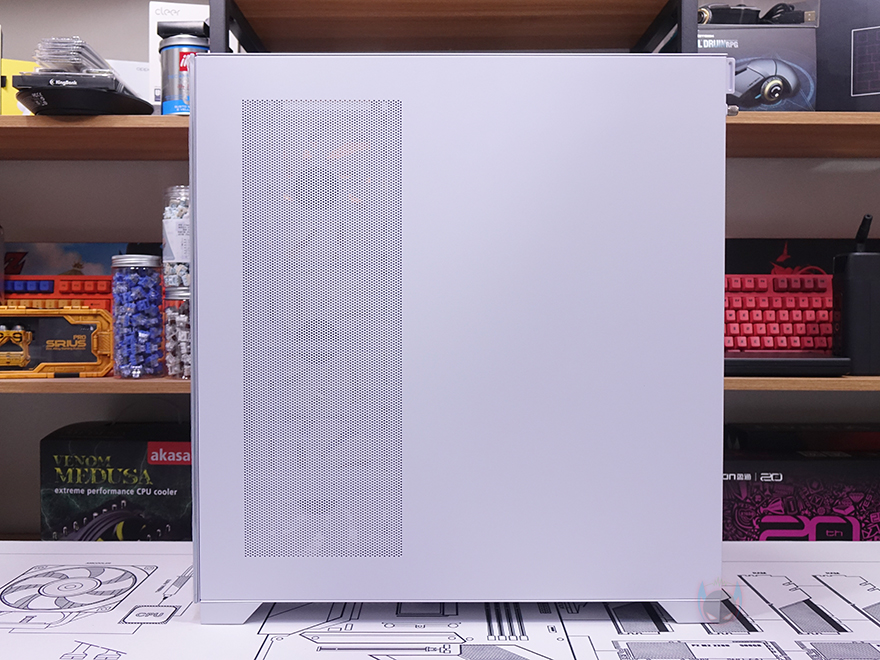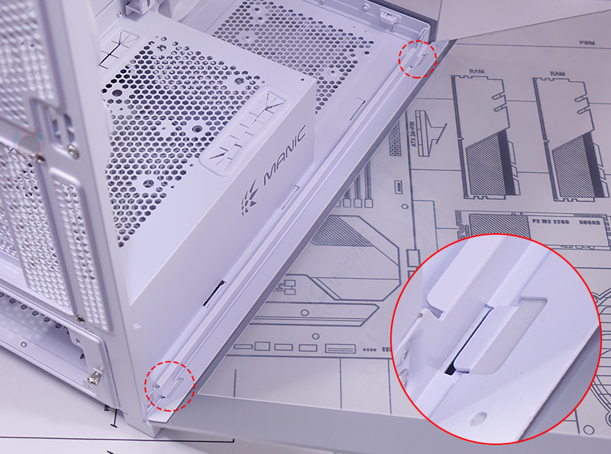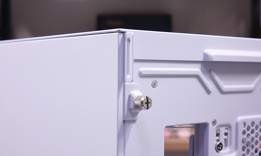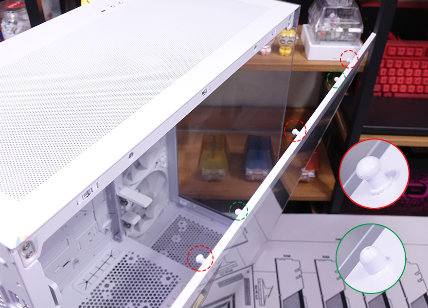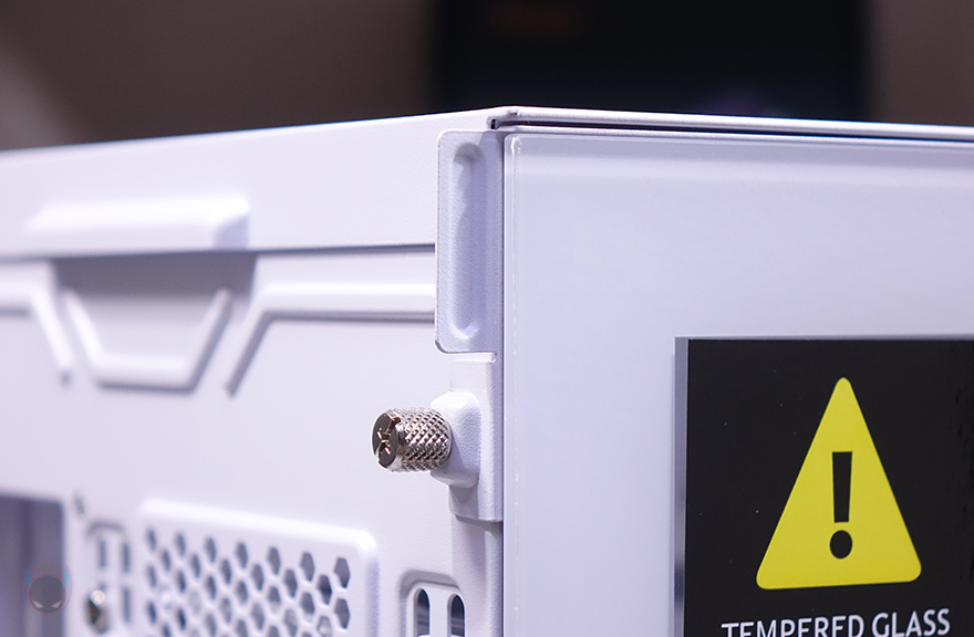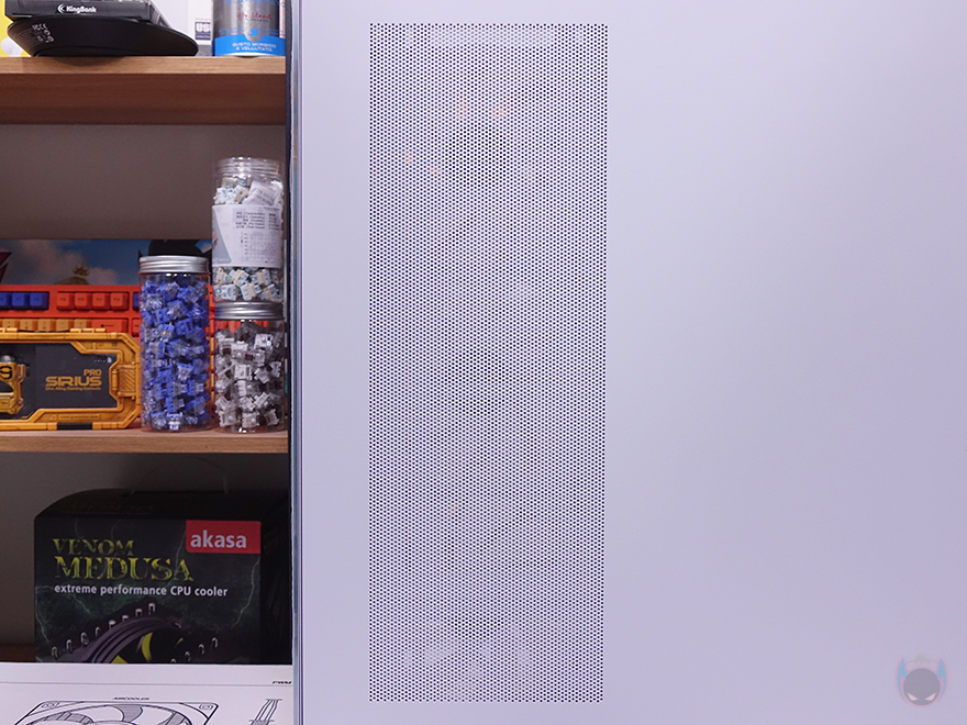 그리고, 어항케이스 특징답게 전면 강화유리의 시각-뷰는 그대로 왼쪽 패널 강화유리 시각-뷰로 이어집니다. 물론, 전면과 측면 강화유리는 따로 분리됩니다. 참고로, 두 강화유리가 만나는 지점에 틈새는 종이 한 장 들어갈 정도입니다. 그리고, 사이드 패널 분리는 후면 손나사를 풀고, 분리할 수 있는데 다른 제품들처럼 볼-헤드핀 클램프 방식을 적용하고 있죠. 또한, 볼-헤드핀 간격 사이에는 고정대도 적용되어 있으며, 패널 아랫부분은 끼우는 걸쇠방식으로 패널 윗부분을 분리했을 때 떨어지지 않도록 했습니다. 오른쪽 사이드 패널은 샤시 패널로 앞부분에 내부 측면 쿨링효과를 볼 수 있게 촘촘한 메쉬 디자인을 적용했으며, 패널 장착은 후면 고장 나사와 볼-헤드핀 방식으로 동일합니다.