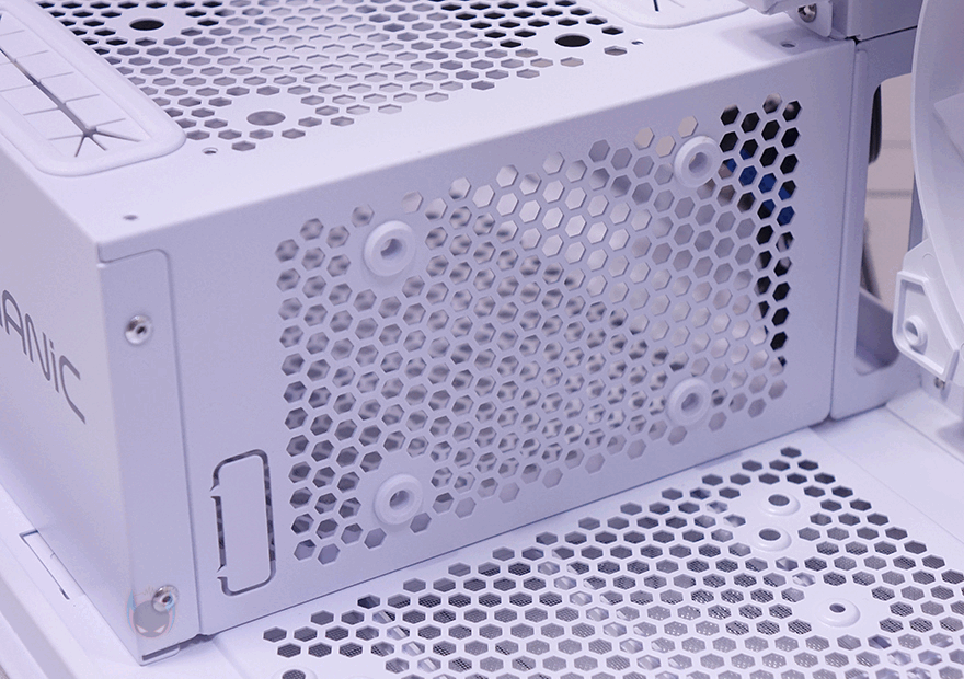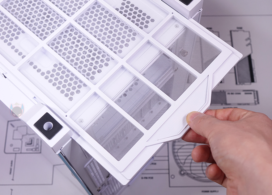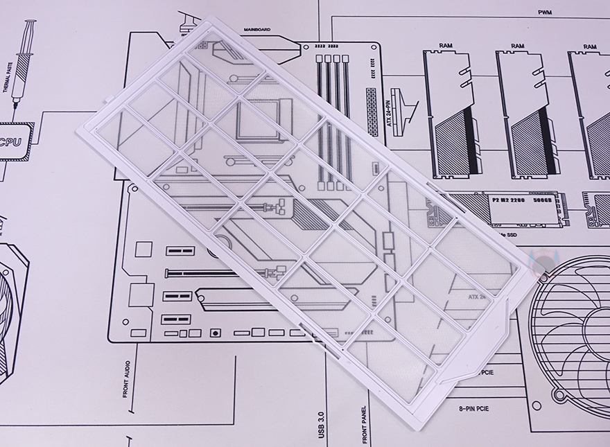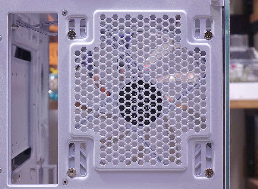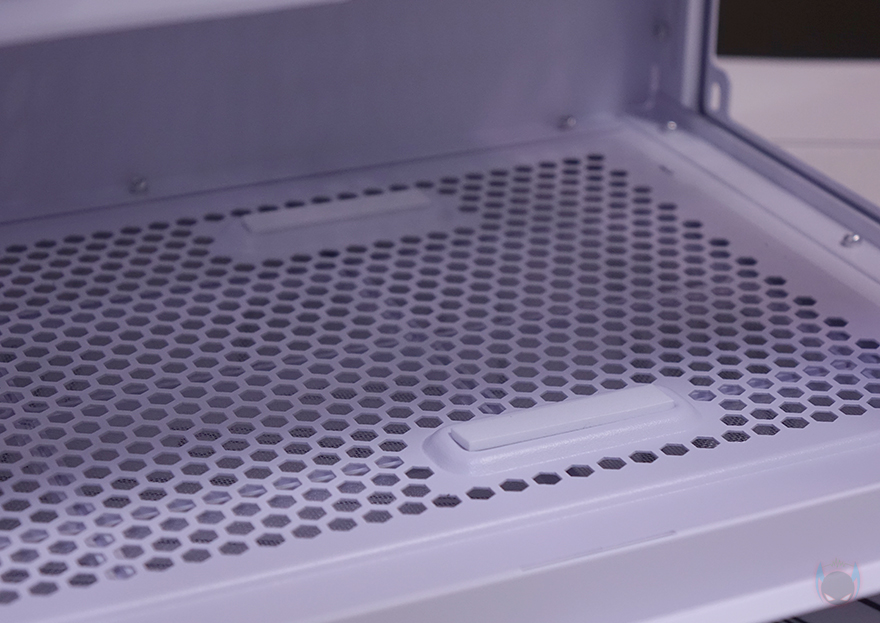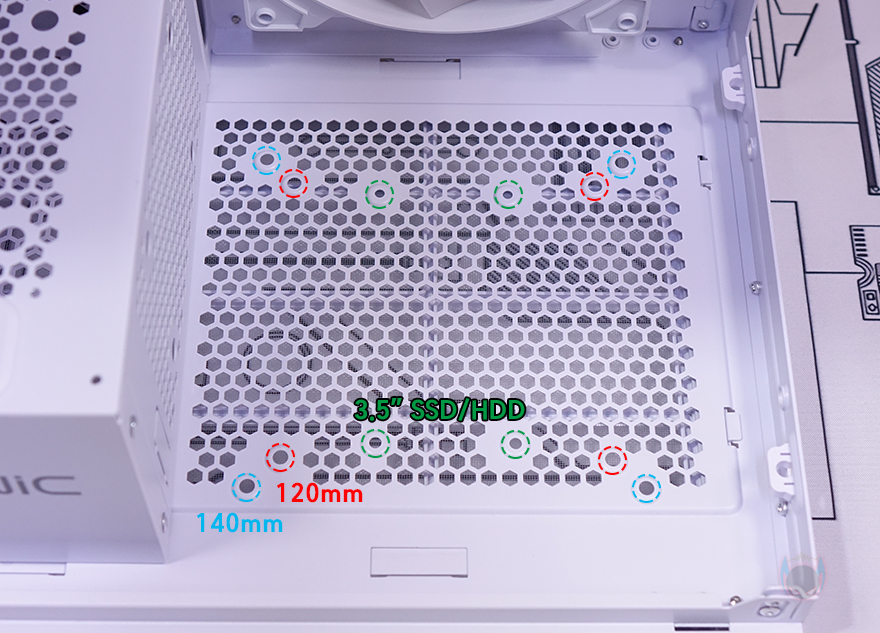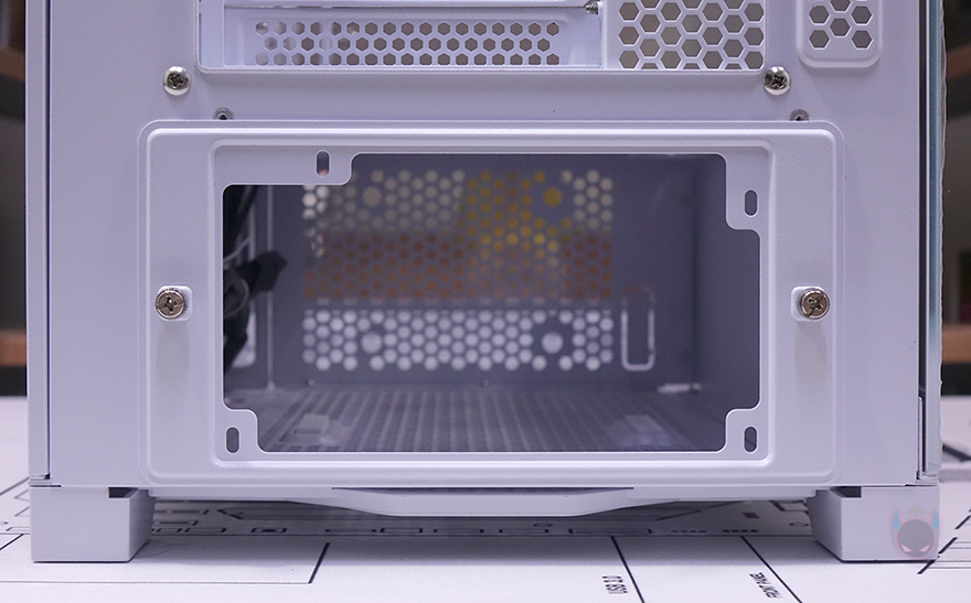 케이스 밑바닥부분에는 약 21mm의 높낮이 받침대와 함께 패드도 기본 부착되어 있으며, 밑바닥 전체를 덮는 분리형 먼지필터도 적용되어 있죠. 조금 아쉬운 점이라면 후방향에서 분리해야 합니다. 먼지필터를 분리하면 쿨링효과를 위한 벌집모양의 에어홀 처리를 확인할 수 있으며, 뒤에서 확인하겠지만, 내부 하단 앞부분에 팬 또는 저장장치를 장착할 수 있는 나사홀이 적용된 것을 확인할 수 있습니다.