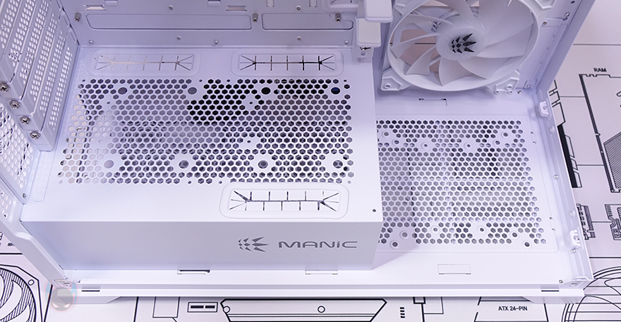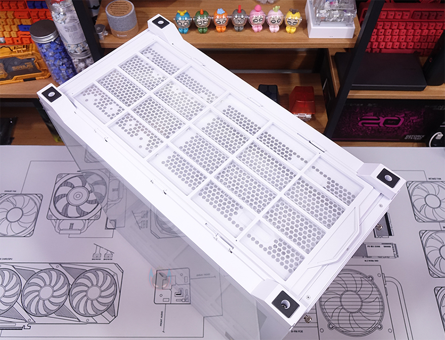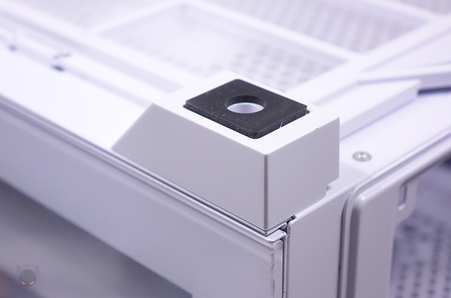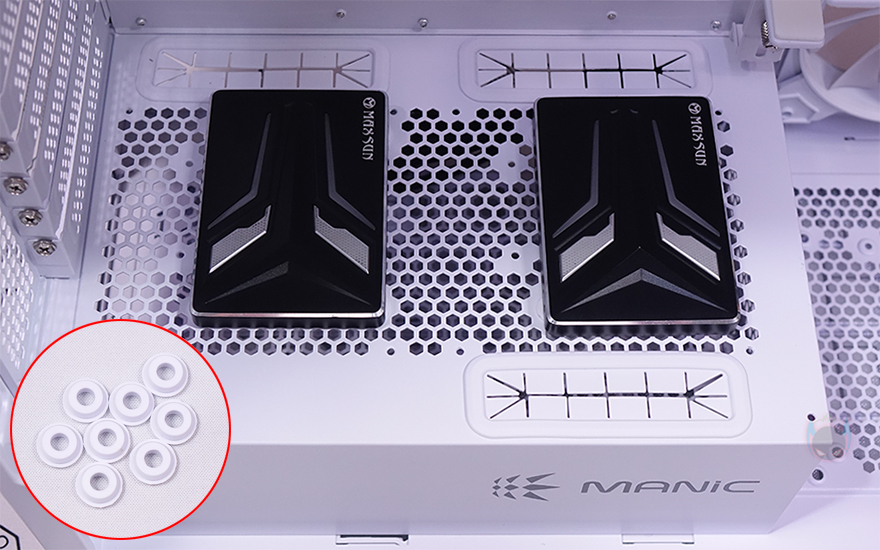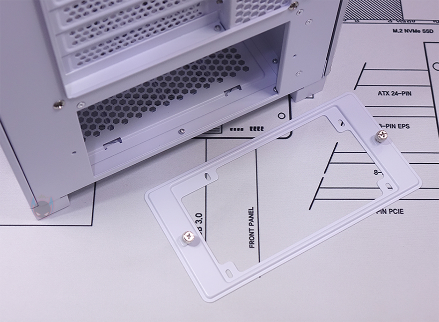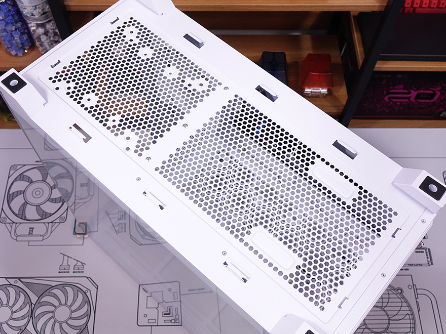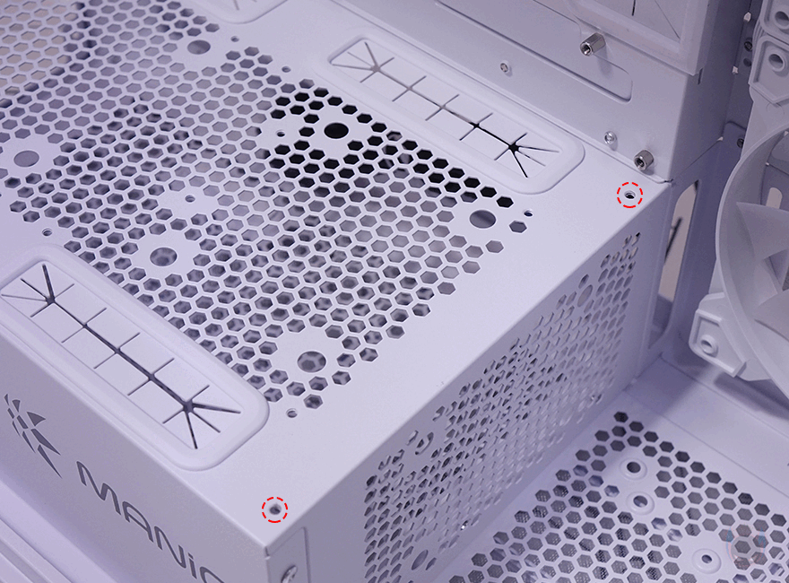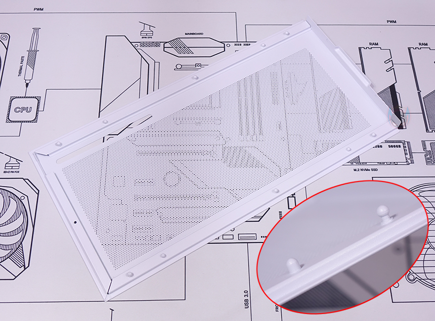 케이스 밑바닥부분에는 약 21mm의 높낮이 받침대와 함께 패드도 기본 부착되어 있으며, 밑바닥 전체를 덮는 분리형 먼지필터도 적용되어 있죠. 조금 아쉬운 점이라면 후방향에서 분리해야 합니다. 먼지필터를 분리하면 쿨링효과를 위한 벌집모양의 에어홀 처리를 확인할 수 있으며, 뒤에서 확인하겠지만, 내부 하단 앞부분에 팬 또는 저장장치를 장착할 수 있는 나사홀이 적용된 것을 확인할 수 있습니다.