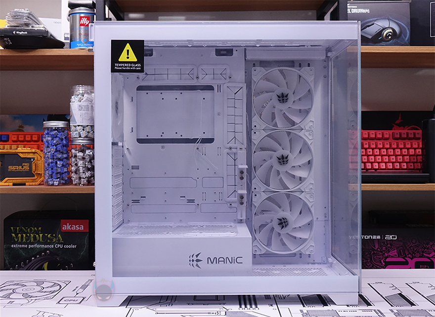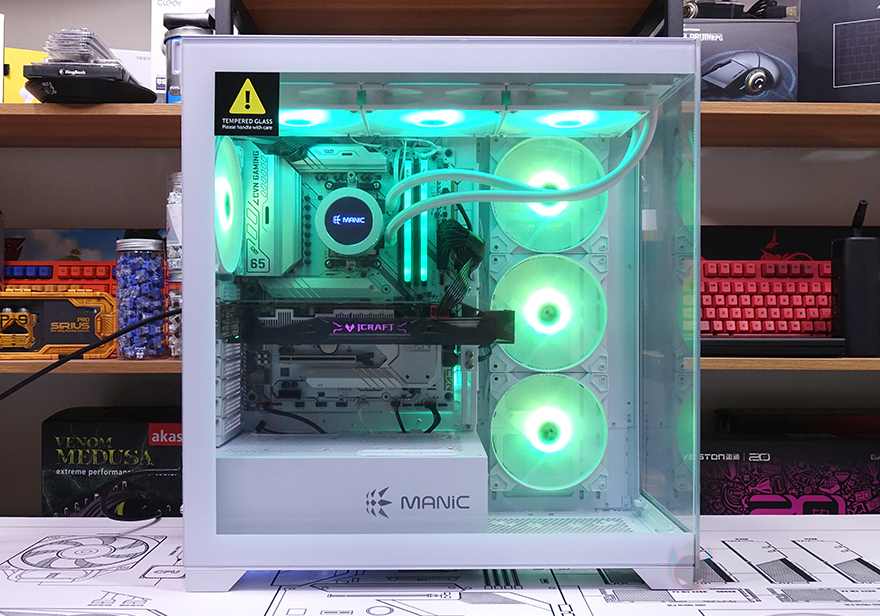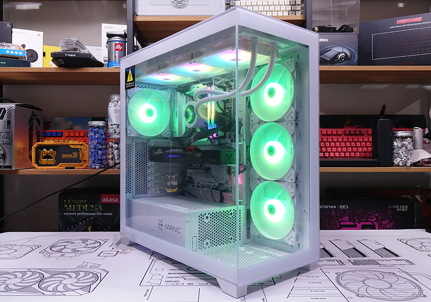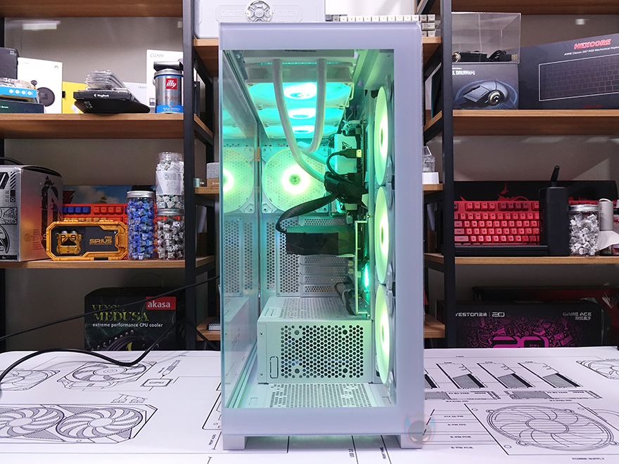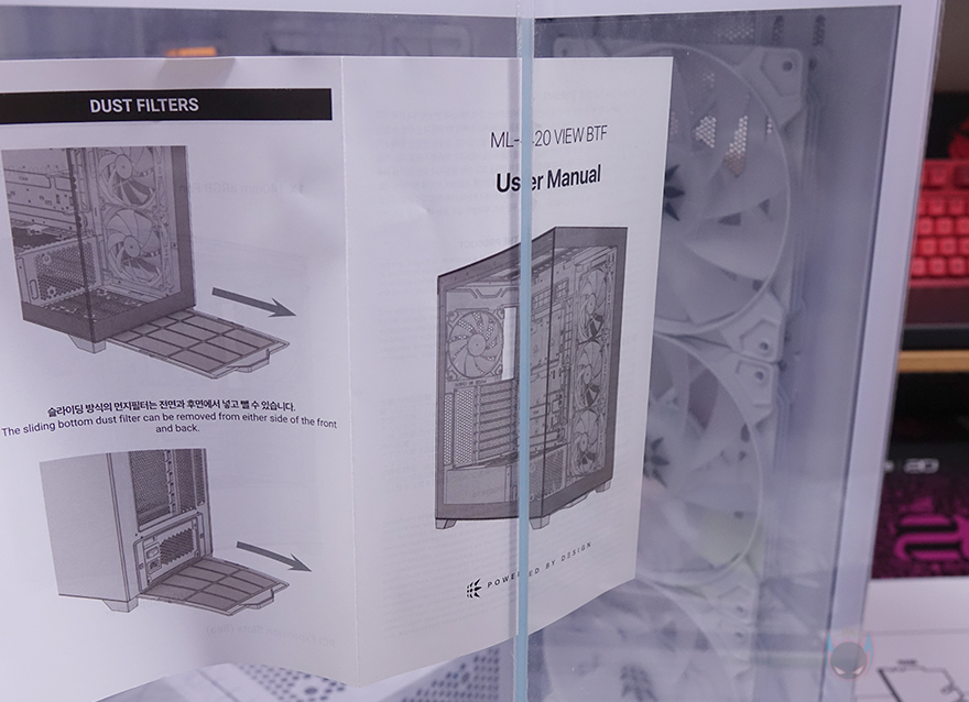 조립 후, ML-420 View BTF PC케이스의 전원을 켜면, 바로 기본 장착된 4개의 팬을 통해 RGB 라이트닝 효과를 확인할 수 있으며, 앞서 확인한 상단에 배치된 LED 버튼을 통해서 다양한 모드로 전환할 수 있습니다. 물론, 허브를 통한 팬 컨트롤러이고, 허브에서 ARGB 헤더도 갖추고 있기때문에, 메인보드에 5V ARGB 헤더가 있다면, 연결해서 메인보드 RGB Sync와 연동해서 사용할 수도 있습니다. 또한, 어항케이스답게 전면과 측면 어느 위치에서 보더라도 내부를 훤히 볼 수 있죠. 끝으로, ML-420 View BTF의 쿨링효과를 확인해 보면, 측면에 배치된 3개의 팬이 리버스 팬 즉 외부 공기 흡입 역할을 하기 때문에, 상단에 쿨링시스템을 갖춘다면 후면과 함께 배기역할로 배치하면 됩니다.
