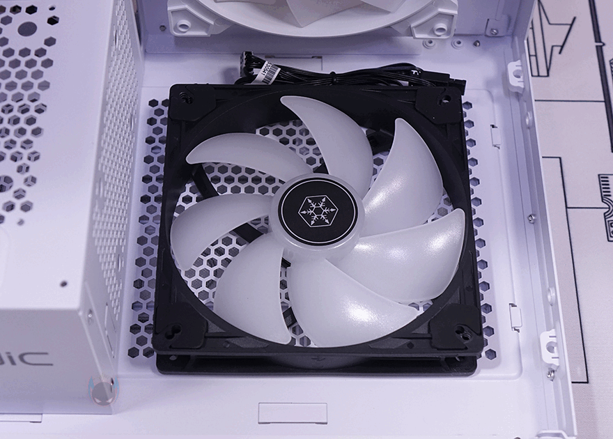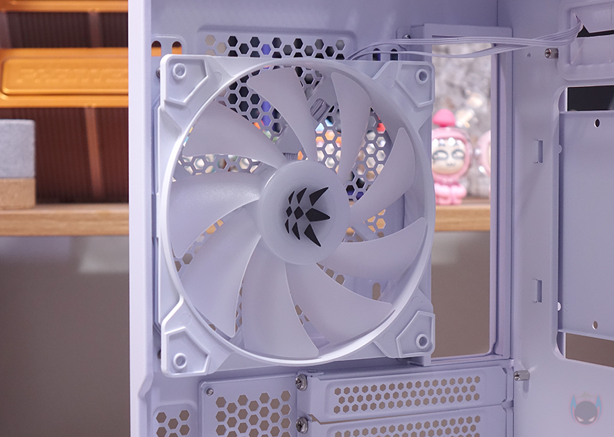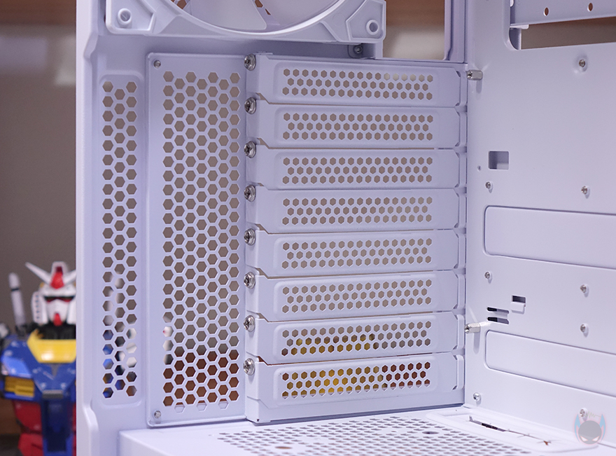 내부 후면에는 외부에서 간접적으로 먼저 확인한 배기 역할의 120mm 팬을 확인할 수 있는데, 역시 RGB 팬입니다. 참고로, 측면과 후면 팬 모두 동일한 팬으로 4Pin(PWM) 방식이며, 600~1600 RPM 속도를 가졌습니다. 그리고, 아래에 PCI슬롯 가이드는 모두 재사용이 가능한 탈착식으로 적용되었죠.