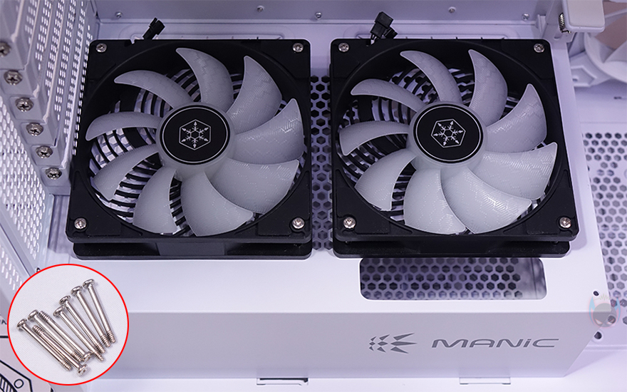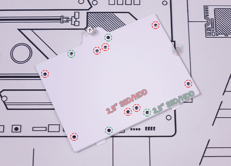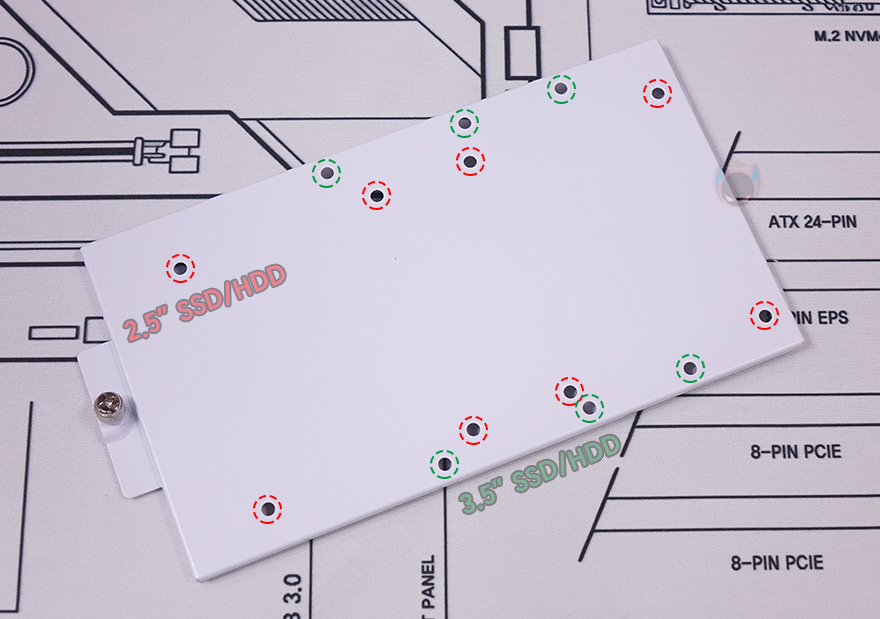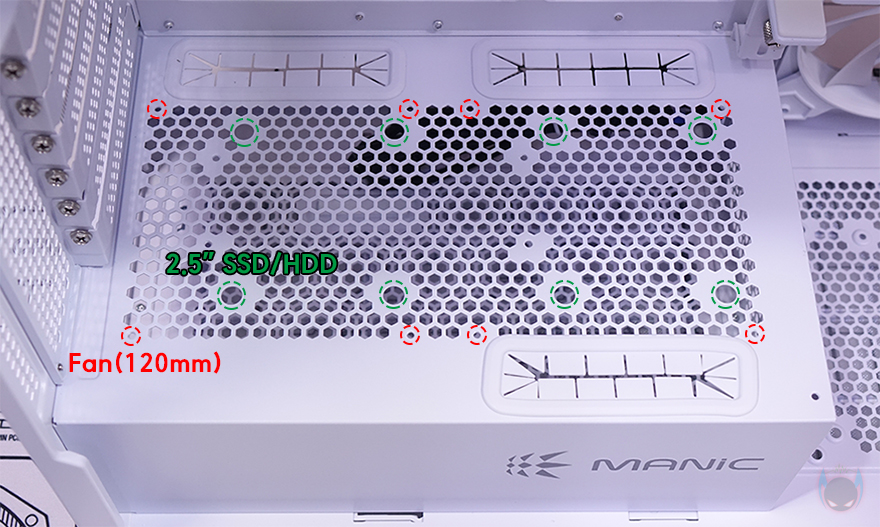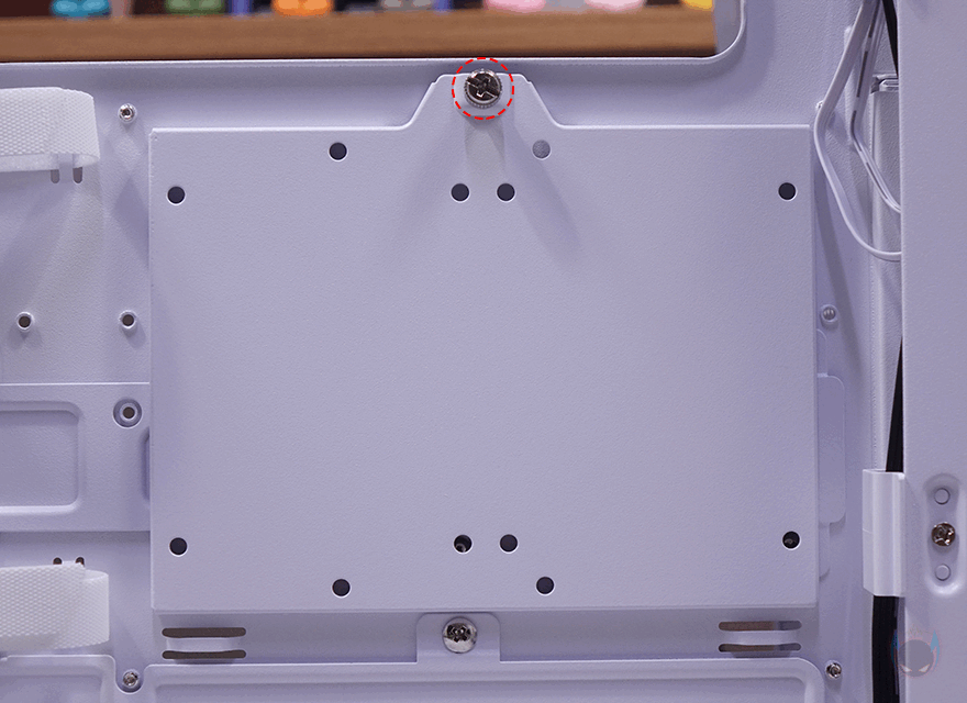이밖에도 CPU-cut-Out 부분에는 저장장치 브라켓이 장착되어 있는데, 고정된 손나사를 풀면 쉽게 분리가 가능하고, 브라켓에는 2.5인치 HDD/SSD 2개 또는 3.5인치 HDD 1개를 장착할 수 있습니다. 그리고, CPU-cut-Out 바로 아래에도 추가 브라켓이 있으며, 이 브라켓 역시 손나사를 풀면 분리가 가능하고, 동일하게 2.5인치 HDD/SSD 2개나 3.5인치 HDD 1개를 장착할 수 있죠. 그리고, 내부 측면 쿨링시스템 부분의 후면을 보면 앞서 언급했듯이 기본 장착된 팬 외에도 120mm 팬이나 수랭쿨러 라디에이터를 장착할 수 있게 나사홀이 적용되어 있습니다.