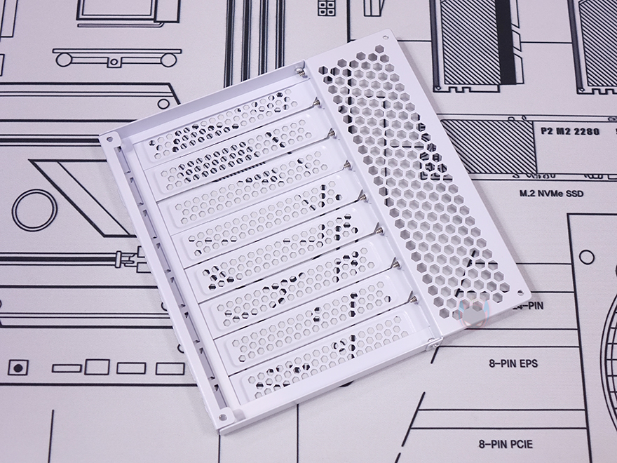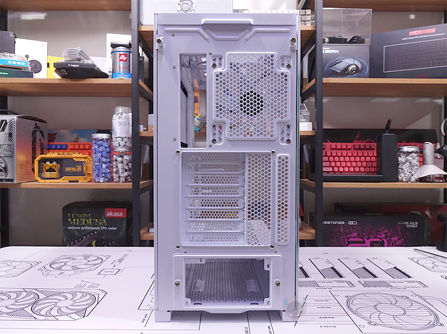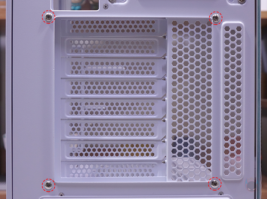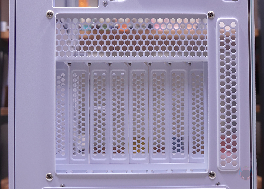 케이스 후면에는 배기 역할을 위한 벌집모양 에어홀 처리와 함께 내부에 140mm 팬이 기본 장착된 것을 간접적으로 먼저 확인할 수 있으며, 팬 위치도 상하로 조절할 수 있게 나사홀이 길게 처리되어 있습니다. 물론, 120mm 팬으로 교체할 수 있게 나사홀도 적용되어 있죠. 그리고, 아래에 PCI 슬롯은 미들타워 기준보다 1개 더 많은 8개를 갖추고 있으며, 슬롯 모서리 부근에 위치한 고정 나사를 풀면 슬롯부분을 통째로 분리 가능합니다. 그리고, 그래픽카드를 수직방향으로 장착할 수 있게 슬롯 방향을 변경시켜 장착할 수 있죠. 물론, 수직방향으로 장착할 때는 별도의 라이저카드를 구비해야 합니다. 그리고, 맨 아래 파워서플라이 자리 역시 브라켓 방식으로 손나사를 풀면 쉽게 분리되고, 브라켓에 파워서플라이를 장착하고 다시 밀어 넣는 방식이죠. 물론, 상하방향으로 장착할 수 있게 나사홀도 적용되어 있습니다.