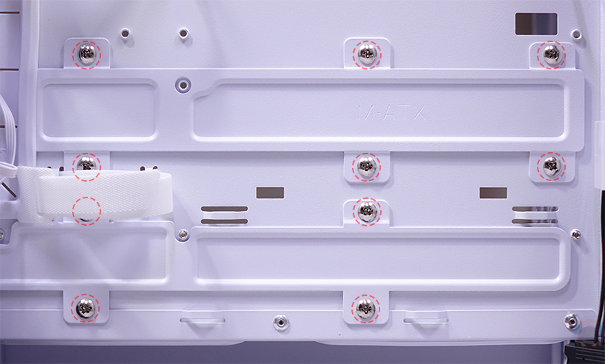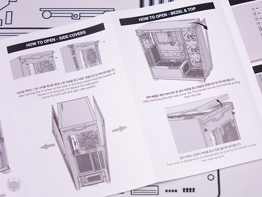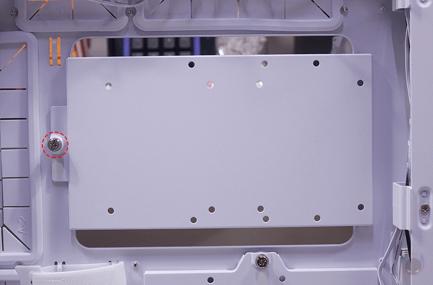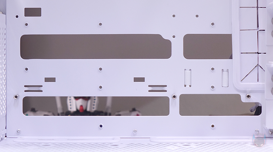 내부를 부위별로 살펴보면, 일단 메인보드가 장착되는 트레이(Tray) 경우 이 제품의 어항케이스 특징외에 또 하나의 특징 바로 BTF 규격이 적용되어 있습니다. 트레이 아랫부분에는 2개의 커버가 적용되어 있는데, 트레이 후면에서 고정 나사를 풀면 커버를 분리할 수 있고, 이러면 BTF 메인보드 사용 시 필요한 후면 커넥터 홀이 확보되죠. 물론, 나머지 트레이 윗부분과 측면에 적용된 라운드 그로밋의 선정리홀 역시 일반 홀보다 더 넓은 그러니깐 BTF 메인보드시 공간을 위한 홀까지 합쳐서 처리되어 있습니다.