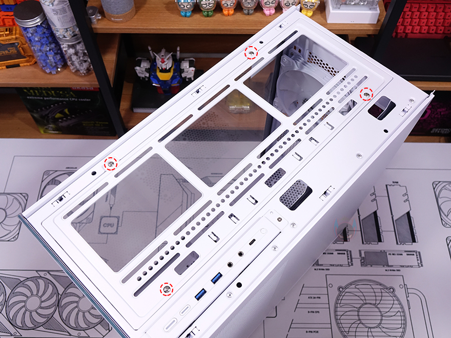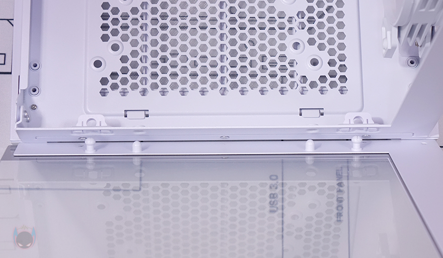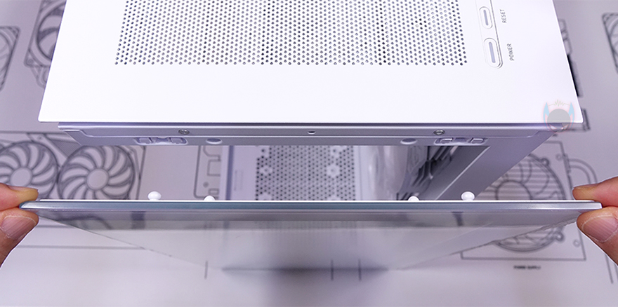 그럼, 이제 마이크로닉스 ML-420 View BTF PC케이스의 내부를 살펴보는데, 그전에 사이드 패널을 분리한 후에 전면 강화유리 패널도 분리할 수 있는데, 역시 볼-헤드핀 방식을 적용했고, 사이드패널과 조금 다른 점은 패널 아랫부분도 볼-헤드핀 방식입니다. 그래서, 전면 강화유리 패널을 분리할 때는 약간 주의가 필요합니다. 그리고, 일반적으로 어항케이스 같은 경우 전면과 측면에 강화유리가 적용되다 보니 서로 만나는 지점에는 내부 프레임이 없기 때문에 일부 제품들은 프렘이 없는 부분으로 상단이 내려앉는 치우침이 발생하는 경우가 생기는데, ML-420 View BTF는 거의 수평을 이루어 전체적인 내부 프레임구조가 단단하다는 걸 확인할 수 있죠.