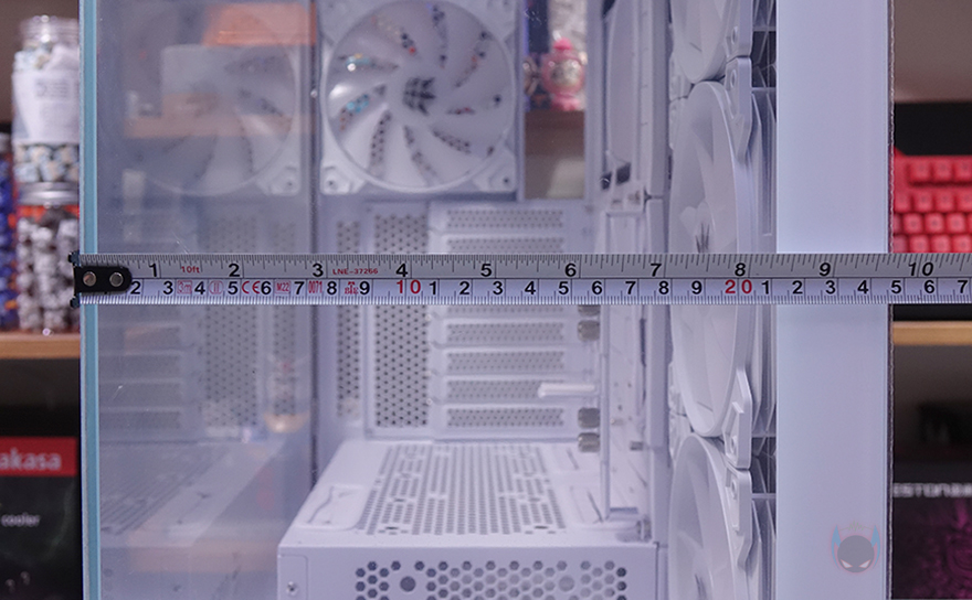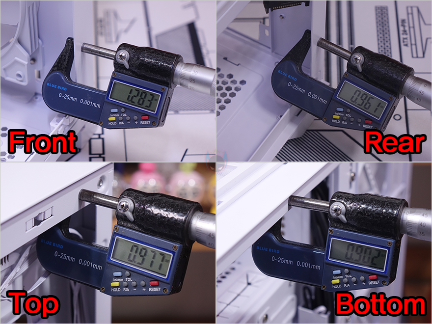 끝으로, 트레이 후면 하단 공간 즉 파워서플라이 자리는 최대 280mm 공간을 확보하고 있어서 일반 소비자에게 판매되는 모든 ATX 규격 파워서플라이는 장착이 가능하고, 받침부분에는 패드도 케이스 색상에 맞춰 화이트 색상으로 기본 부착되어 있죠. 그리고, ML-420 View BTF PC케이스에 사용된 샤시의 두께는 부위별로 측정해 보면 약 0.9~1.2mm대로 도장두께를 고려했을 때 제조사언급대로 0.8T 샤시가 사용되었음을 짐작할 수 있습니다.