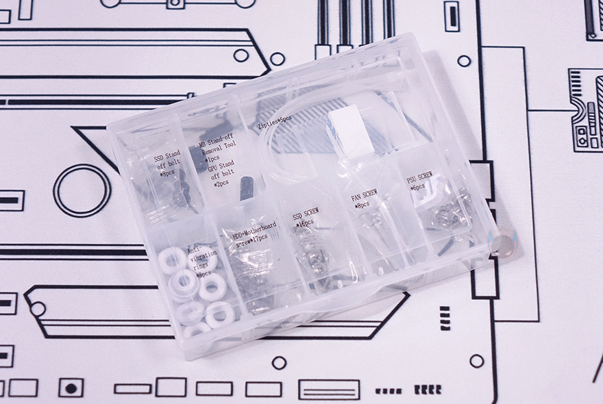 내부 하단에는 파워서플라이 커버가 적용되어 있는데, 하단 전체가 아닌 메인보드 트레이 위치까지만 적용했습니다. 최근 이런 구조의 PC케이스들이 많이 나오는 편이죠. 커버 상단에는 에어홀 처리와 함께 내부 하단 쿨링시스템을 갖출 수 있게 120mm 팬 나사홀을 적용해놨는데, 최대 2개까지 장착이 가능하고, 이때는 기본 제공되는 긴 나사를 사용하면 됩니다. 또한, 팬 대신에 저장장치도 장착할 수 있는데 2.5인치 HDD/SSD 2개를 장착할 수 있으며, 역시 기본 제공되는 나사와 패킹을 사용해 손쉽게 탈부착해도록 했죠. 또한, 커버 측면에도 역시 동일하게 추가로 2.5인치 HDD/SSD를 장착할 수 있게 지원하고 있습니다. 그리고, 커버가 없는 내부 맨 앞부분 하단 역시 앞서 외부 하단에서 언급했듯이 팬 또는 저장장치를 장착할 수 있게 나사홀이 적용되어 있으며, 팬은 140/120mm 1개를 장착할 수 있고, 저장장치는 3.5인치 HDD를 장착할 수 있습니다.
