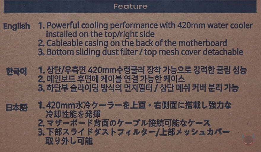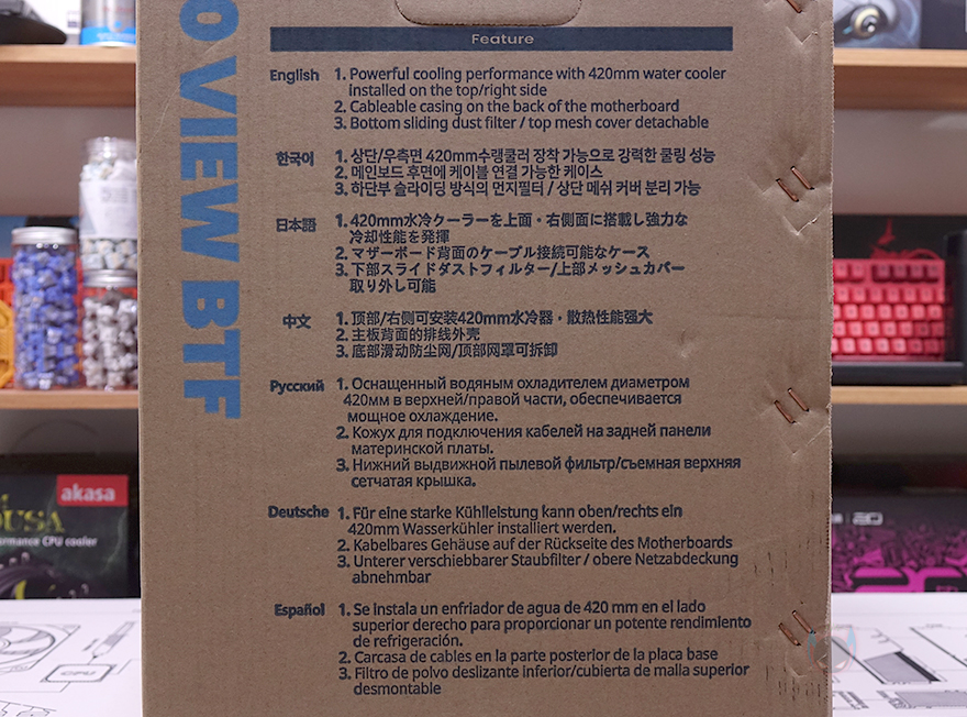 제품 박스부터 살펴보면, 전후면은 색상만 다를 뿐 동일한 디자인으로 마이크로닉스 로고와 제품명을 표기하고 있습니다. 제품명에서 알 수 있듯이, 어항케이스를 의미하는 뷰(View), 그리고 BTF가 적용된 케이스라는거죠. 박스 측면에는 한국어를 포함해 각 나라별 언어로 주요 특징을 담고 있는데, 수랭쿨러 라디에이터, BTF, 먼지필터 및 커버 분리 내용입니다. 또한, 반대쪽 측면에는 제품의 기본사양을 표기해 놨는데, 패키지 크기부터 PC케이스 크기, 쿨링지원 등 상세하게 표기를 해놨기 때문에, 오프라인 매장에서 구매할 때도 충분히 정보를 얻을 수 있습니다.