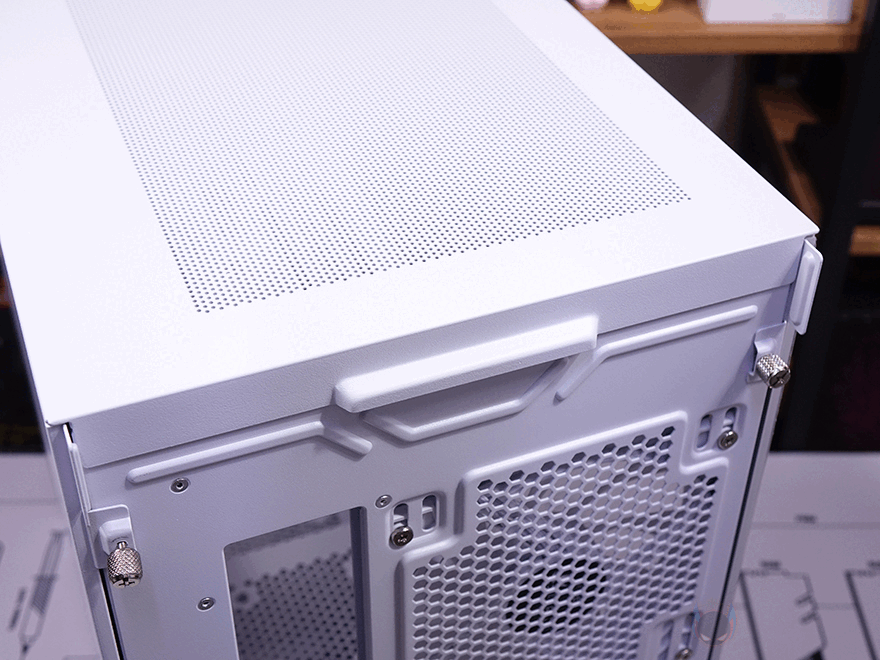 ML-420 View BTF 케이스 상단 패널은 앞부분 맨 오른쪽에 버튼 및 포트를 배치해놨는데, 맨 앞에 전원버튼을 시작으로 뒤로 리셋버튼, USB 3.0 포트 2개, 오디오, 마이크, USB 타입 C 포트, LED 버튼순으로 나열되어 있죠. 그 외에 나머지 영역은 모두 상단 쿨링효과를 위해 메시 디자인을 적용했으며, 상단 패널 역시 무나사의 볼-헤드핀 방식으로 후면 손잡이 부분을 잡고 위로 올리면 쉽게 분리가 됩니다. 패널은 분리하면 내부 쿨링시스템을 갖출 수 있게 팬과 수랭쿨러시 라디에이터 장착을 위한 나사홀들이 적용되어 있는데, 이 부분은 분리할 수 있는 브라켓으로 고정 나사를 풀면 쉽게 따로 분리해서, 브라켓에 팬이나 라디에이터를 장착해서 다시 브라켓만 고정해 주면 되죠. 참고로, 팬은 140/120mm 최대 3개 장착할 수 있으며, 수랭쿨러시 라디에이터는 최대 420mm까지 장착할 수 있습니다.
