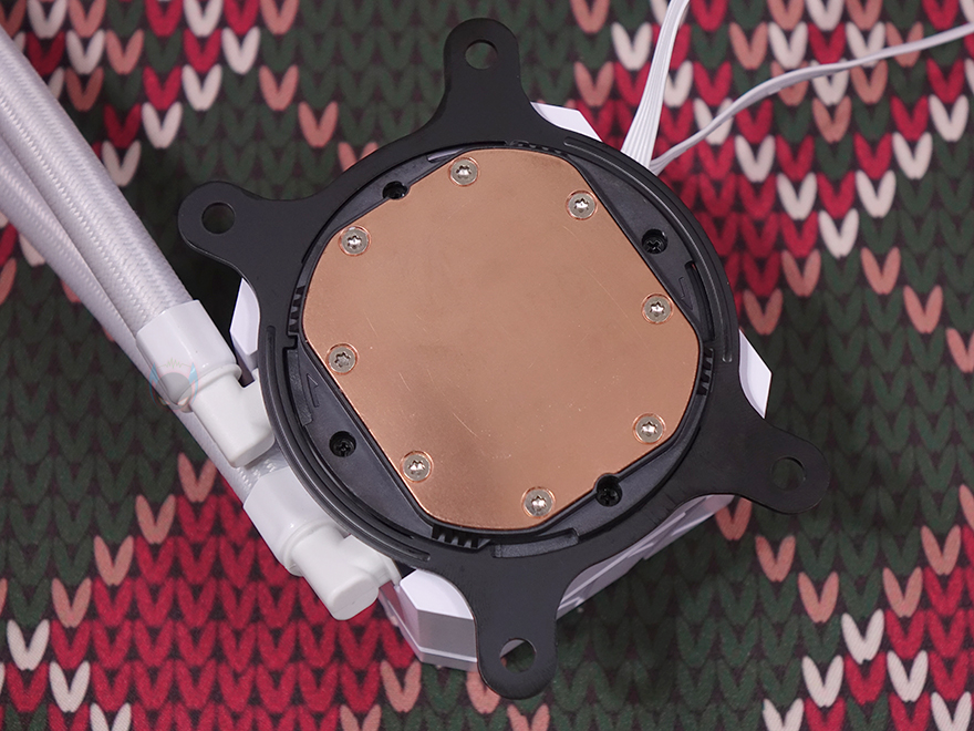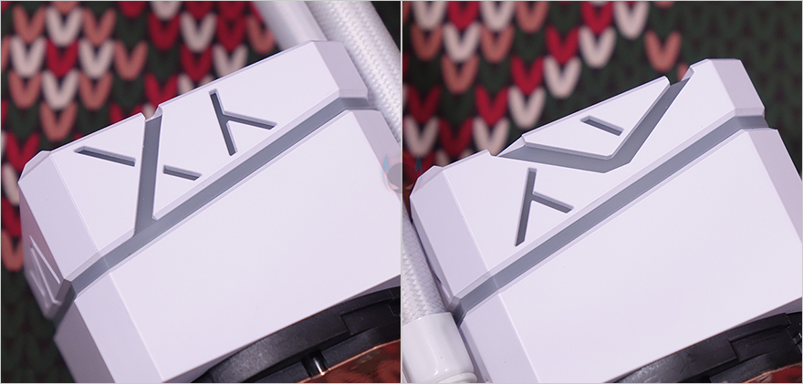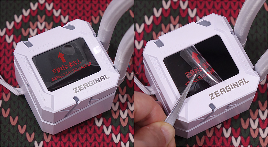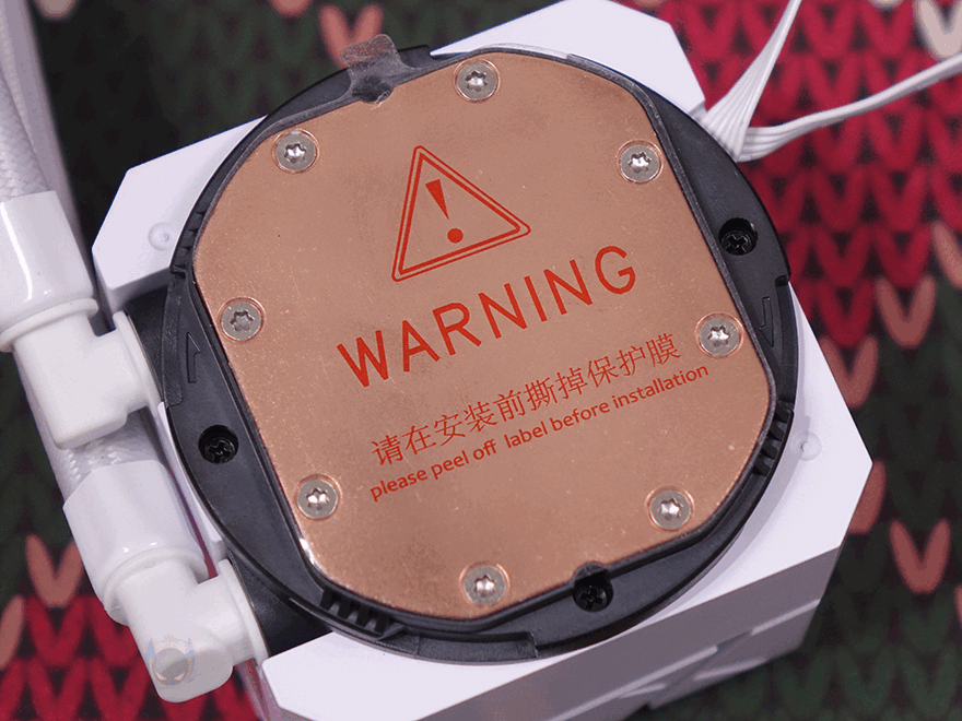 워터블록(Water block) 디자인은 사각형 디자인에 상단에 2.4인치 LCD 스트린이 적용되어 있습니다. 개봉 시에는 보호비닐이 부착되어 있기 때문에 사용 전 제거를 해야 합니다. 뒤에서 확인하겠지만, 스크린을 사용하기 위해서는 전용소프트웨어를 설치해줘야 합니다. 그리고, 측면으로 팬과 마찬가지로 RGB 효과를 볼 수 있게 디자인이 적용되어 있죠. 그래서, 워터블록에 연결된 케이블은 펌프 작동의 3 pin 커넥터 외에 역시 메인보드 RGB Sync와 연결되는 5V ARGB 커넥터가 있고, 추가로 LCD 스크린 전원공급을 위한 USB 커넥터가 연결되어 있습니다. CPU와 맞닿는 베이스(Base) 부분은 구리(Copper) 재질이며, 매끄럽게 래핑처리가 되어있고, 사용 전에 역시 보호비닐을 제거해야 합니다.