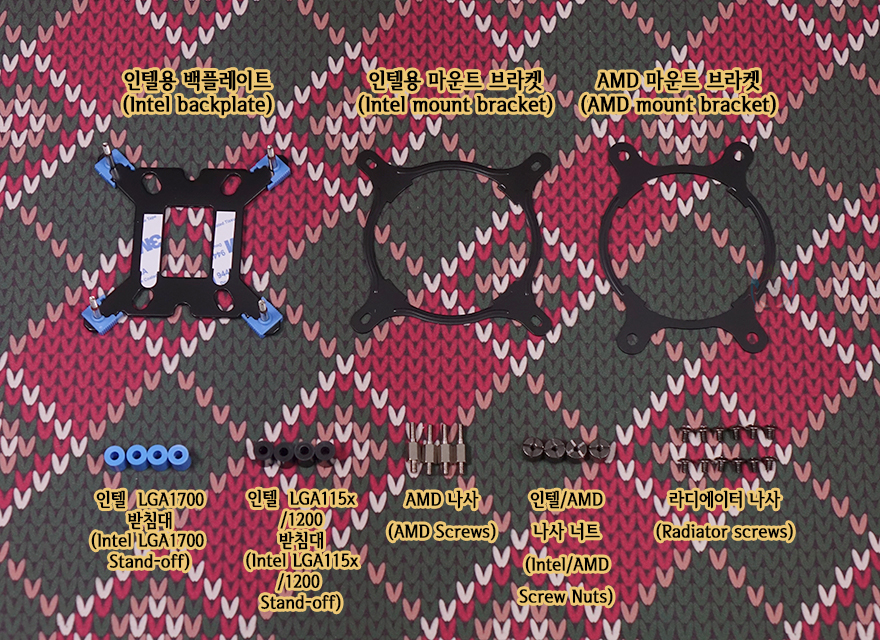 박스를 열어보면, 외부 충격방지를 위한 포장재로 우레탄-폼을 사용했으며, 쿨러는 비닐포장으로 처리되어 있으며, 나머지 부속품들은 분실되지 않게 별도의 박스 포장으로 이루어져 있습니다. 또한, 부속품 박스를 열어보면, 나사 같은 부속품들은 용도별로 표기해서 따로 포장되어 있죠. 제품구성은 ZC-ZEUS XT 360 수랭쿨러, 인텔용 마운트 브라켓, AMD용 마운트 브라켓, 인텔 LGA 1700 Stand-off와 LGA 115x/1200 Stand-off, AMD용 나사, 인텔/AMD용 나사 너트(Nuts), 기본 써멀컴파운드 제공으로 이루어져 있습니다.