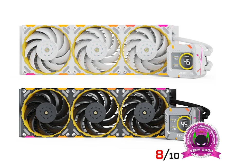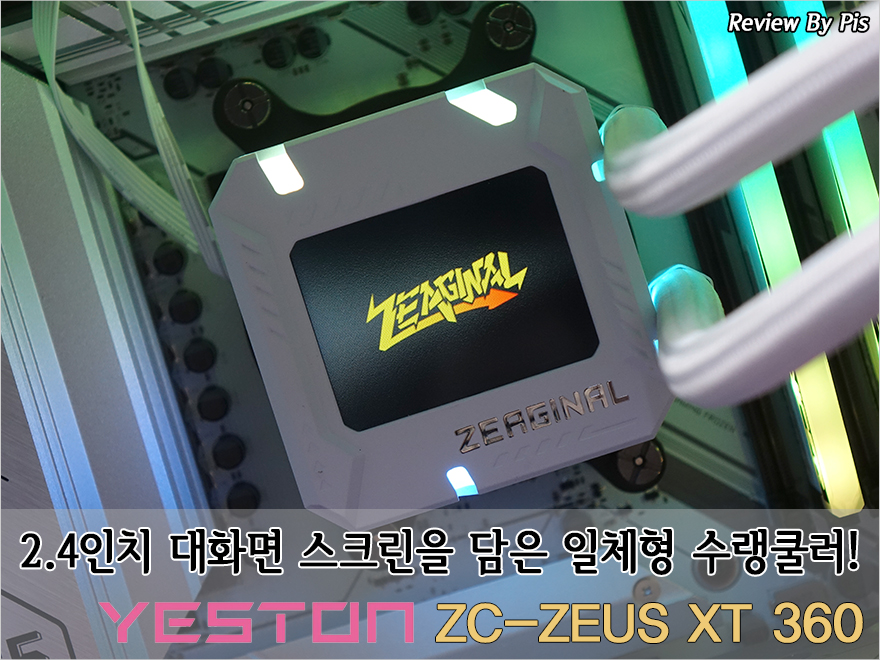 Yeston의 수랭쿨러 정확히는 일체형 수랭쿨러(AIO Liquid Cooler)인 ZC-ZEUS XT 360은 최근 수랭쿨러 시장의 트렌드를 제대로 반영하고 있는 제품입니다. 블랙과 화이트 2가지 색상을 시작으로 기본 제공되는 120mm 팬은 모두 모듈러(Modular) 방식으로 깔끔하게 장착된 모습과 케이블정리가 수월하도록 했죠. 여기에 워터블록에는 2.4인치 LCD 대화면 스크린이 적용되어서 다양한 이미지 스크린을 적용해 사용할 수 있습니다. 또한, 팬과 워터블록에 RGB 라이트닝 효과도 적용되어 있죠. 특히, 팬 같은 경우에는 프레임 분리도 가능해 올-화이트(All-white) 또는 올-블랙(All-black) 팬으로도 사용할 수 있습니다. 물론, 쿨러 제품이기때문에 가장 중요한 쿨링 성능 역시 만족스러운 모습을 보여줍니다. 특히, 360mm 라디에이터 같은경우 3개의 팬을 장착하고 워터블록의 펌프까지 작동되는 점을 고려해도 소음은 큰 편이라 좀 더 매리트 있게 다가오죠. 그리고, CPU 온도도 확실히 잡아줍니다. 조금 아쉬운 부분이라면, LCD 스크린을 사용하기 위해서는 제공되는 소프트웨어를 필수적으로 사용해야 하는데, 중국어만 지원하기 때문에 약간의 불편함이 있습니다. 그래도, 과하지 않은 RGB 효과에 팬 프레임 분리로 경우에 따라서 더 심플한 느낌으로 사용할 수 있어서, 블랙과 화이트 콘셉트의 조립 PC를 맞출 때 충분히 추천해 줄 만한 일체형 수랭 쿨러입니다. 그럼, 이상으로 마치겠습니다.