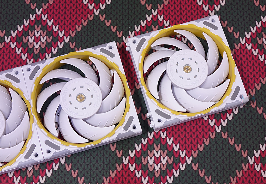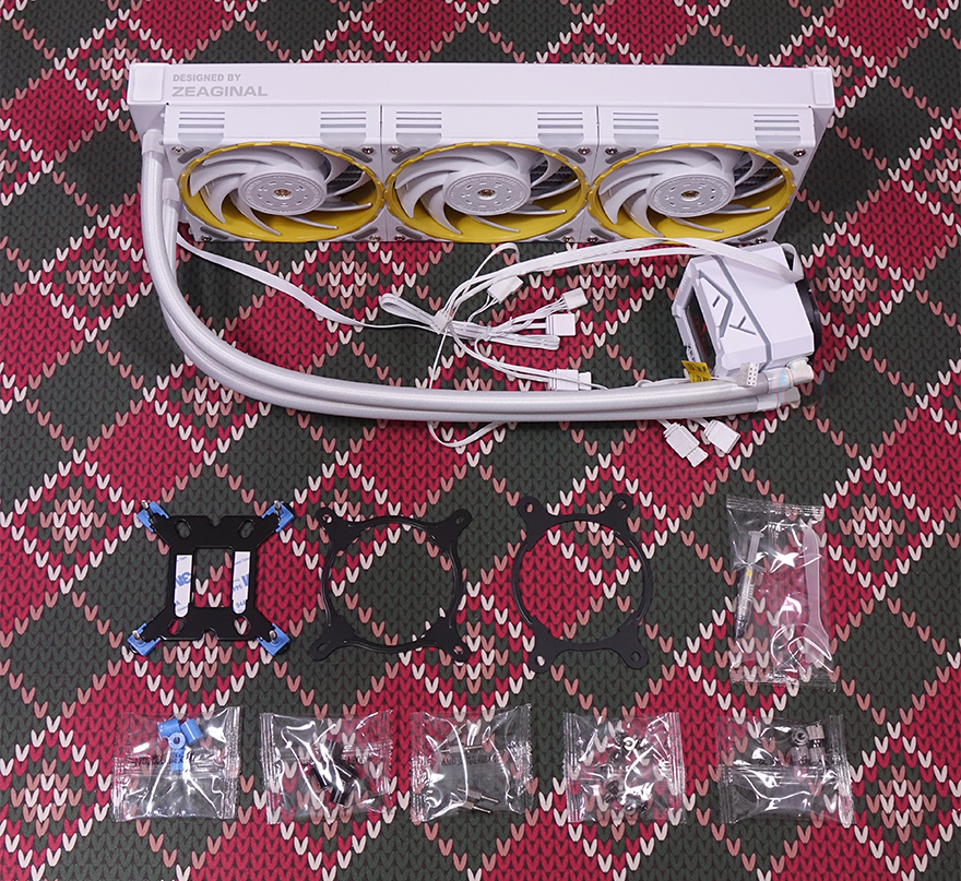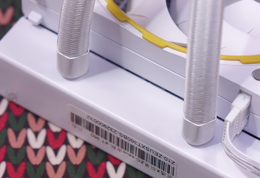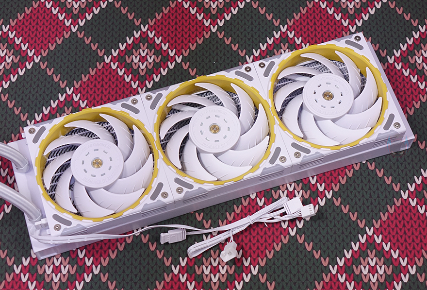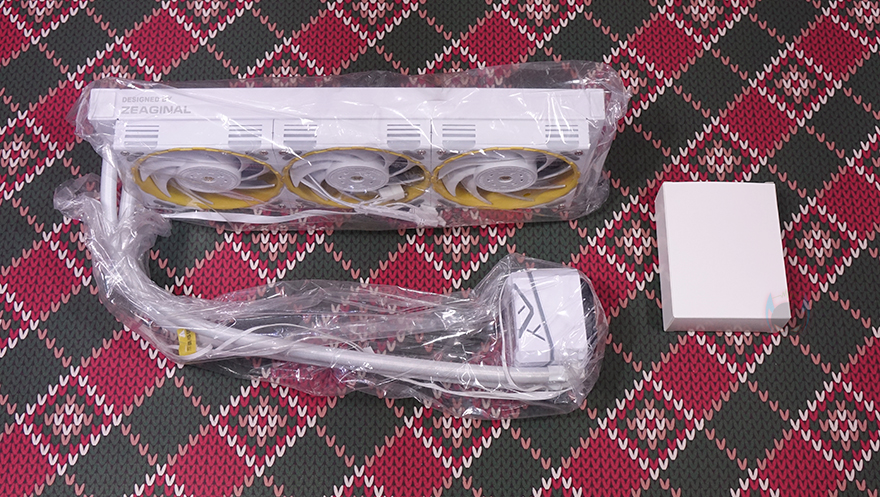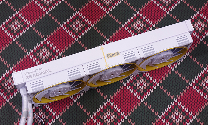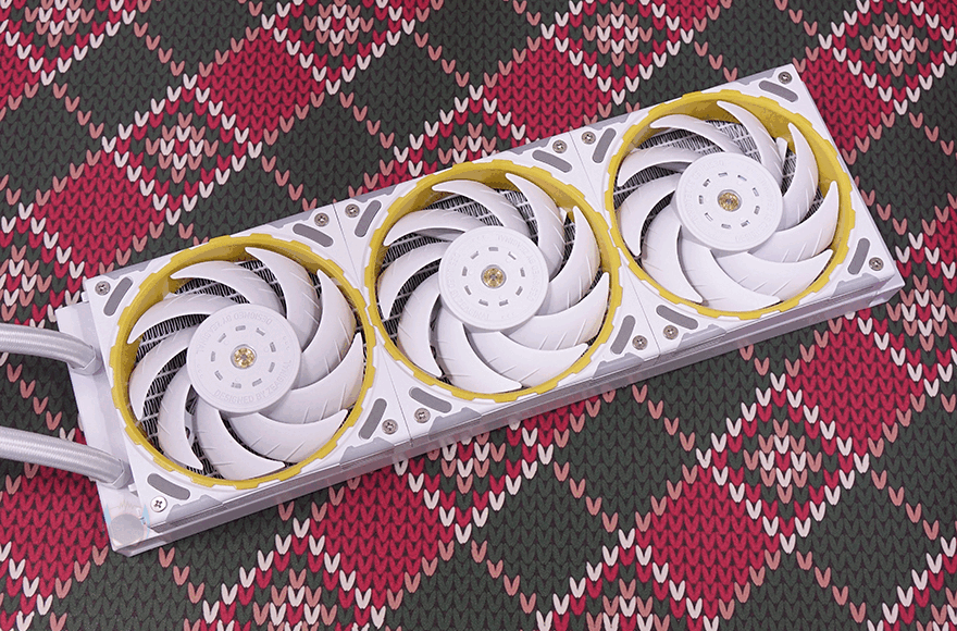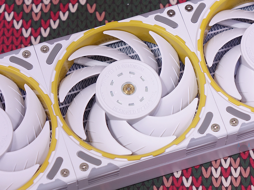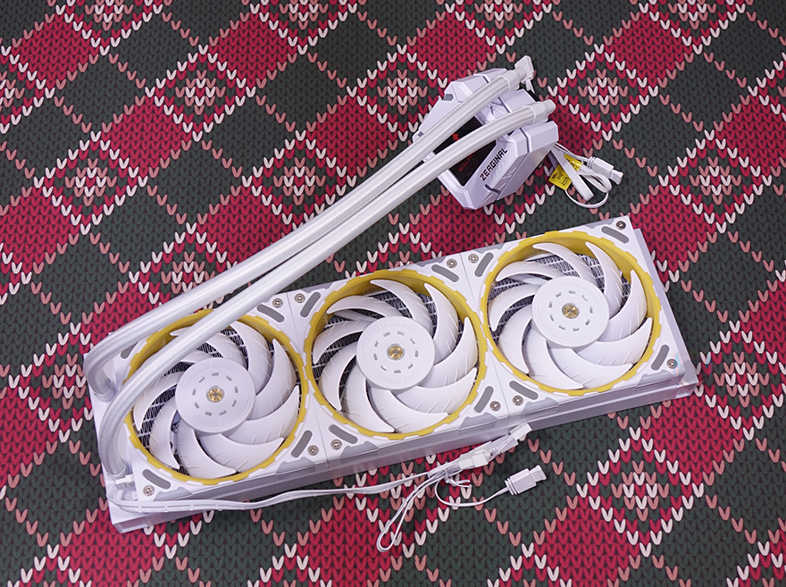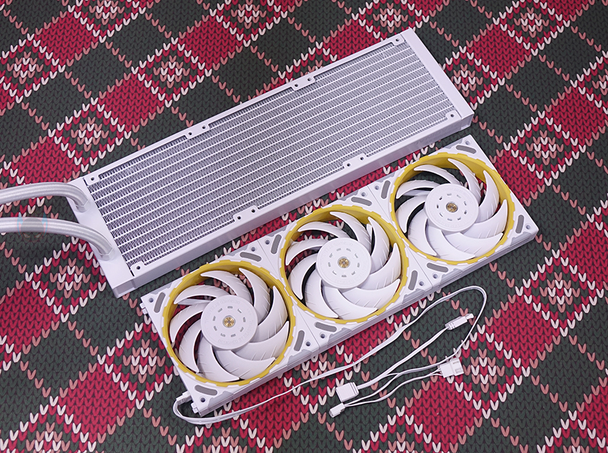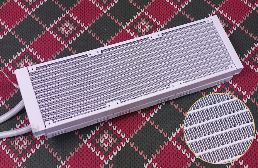 그럼, 본격적으로 Yeston ZC-ZEUS XT 360 수랭쿨러를 살펴보는데, 일단 색상은 앞서 언급했듯이 블랙(Black)과 화이트(White) 2가지 색상으로 출시되었으며, 라디에이터(Radiatore) 길이도 360mm와 240mm 2가지로 출시되었습니다. 리뷰에선 360mm의 화이트색상으로 살펴볼 텐데, 개봉 시 라디에이터에 팬(Fan)은 기본 장착되어 있습니다. 360mm 라디에이터이기 때문에 120mm 팬 3개가 장착되어 있죠. 라디에이터와 팬까지 합쳐진 두께는 약 52mm로 전형적인 두께를 가졌으며, 라디에이터 반대쪽에는 추가로 팬을 장착해 듀얼로도 사용할 수 있게 나사홀이 처리되어 있으며, 라디에이터의 방열핀도 촘촘하게 균일하게 적용되어 있습니다.