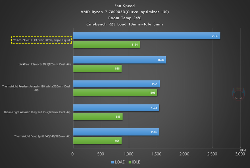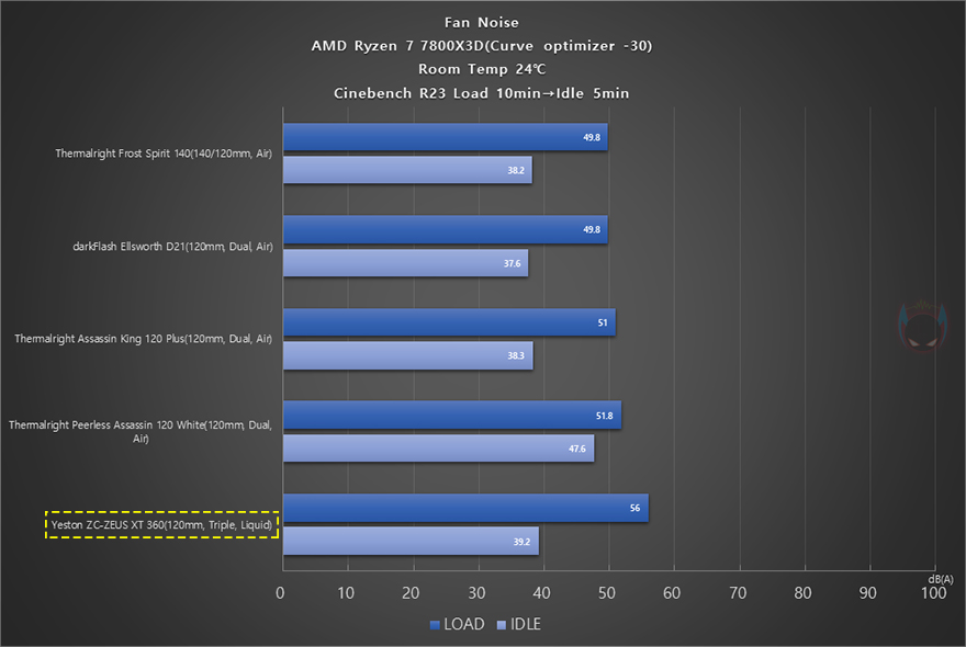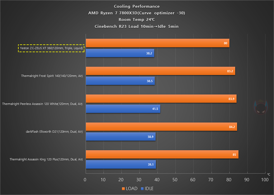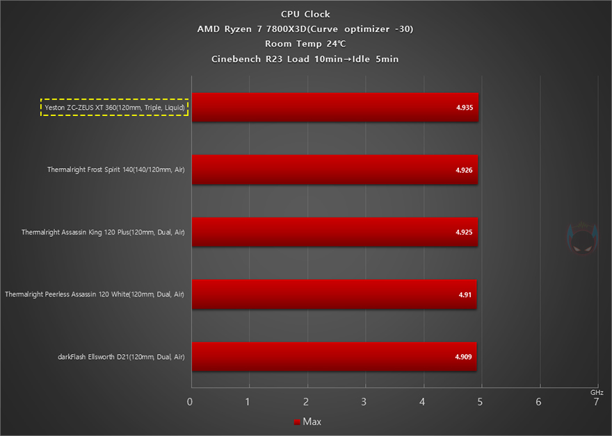 끝으로, 이제 Yeston ZC-ZEUS XT 360 수랭쿨러(Liquid Cooler)의 쿨링 성능(Cooling performance)을 확인해 보는데, 인텔(Intel)/AMD 모두 최근 CPU들은 부스터 클럭이 높게 나오기 때문에 예전처럼 CPU 오버클럭에 대한 매리트가 없습니다. 그래서, 현재 가장 소비자들에게 인기가 많은 CPU를 사용해서 테스트를 진행할 건데, 바로 AMD 라이젠 7 7800X3D입니다. 라이젠 7 7800X3D CPU는 오버클럭은 지원하지 않지만, 소비자들이 커브옵티마이저(-30) 설정을 통해 많이 사용하기 때문에 이를 통한 설정으로 Load와 Idle 상황을 CineBench R23으로 10분간 실행해 CPU 온도, 팬 속도와 소음, 그리고 쿨링 성능에 따른 CPU 최대 클럭차이를 확인해 보겠습니다.