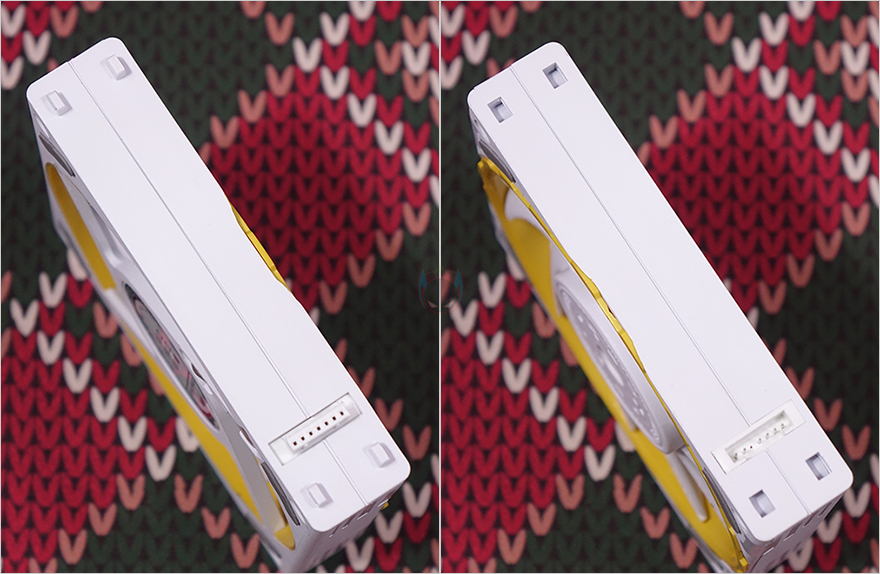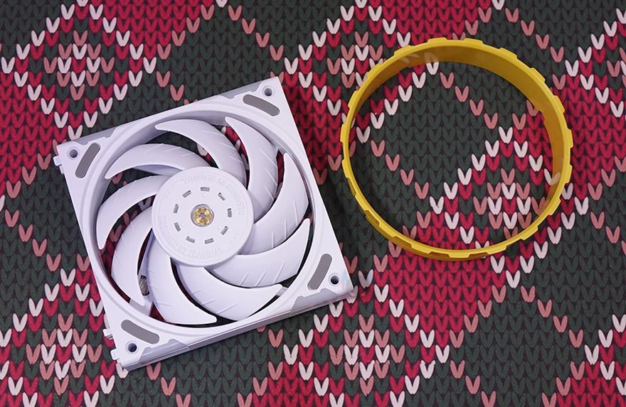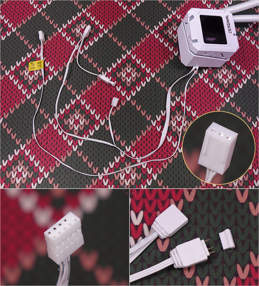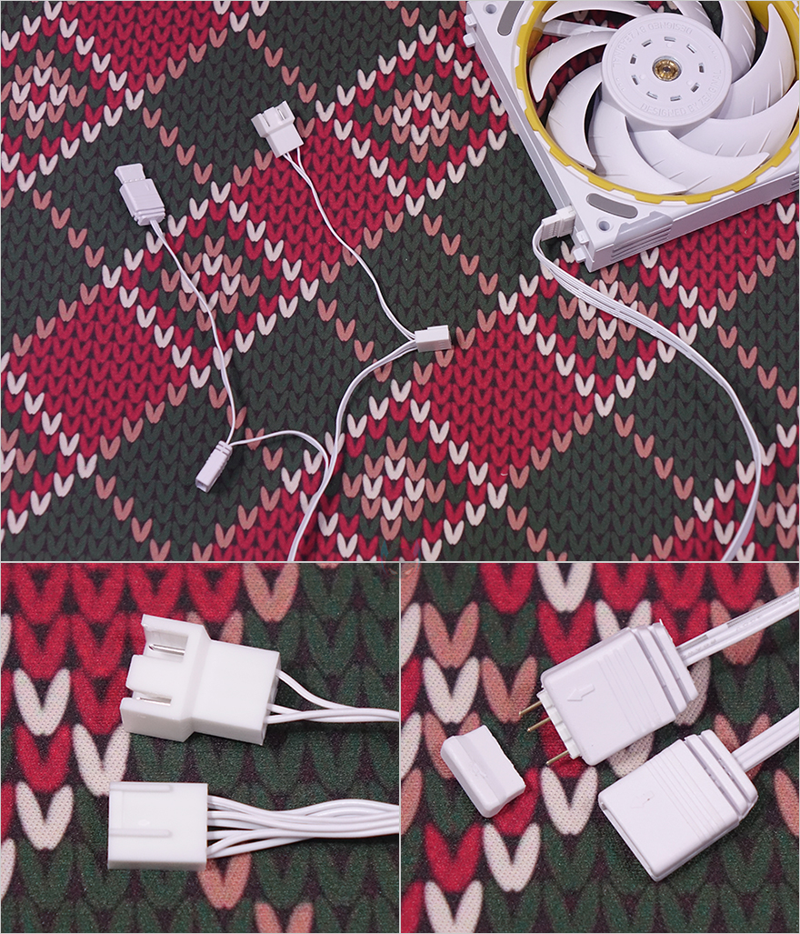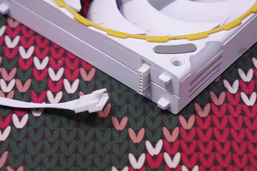 기본 장착된 3개의 팬(Fan)은 나사(Screws)만 풀면, 쉽게 분리가 되고, 팬을 살펴보면, 한쪽에만 케이블이 연결된 것을 확인할 수 있습니다. 참고로, 팬 작동은 4핀 PWM 방식이며, 속도는 900~2200 RPM(+10%) 범위를 가졌고, FDB 베어링 팬입니다. 그리고, 뒤에서 확인하겠지만, 팬 측면으로 RGB 효과를 보여주기 때문에, 메인보드 RGB Sync와 연결되는 5V ARGB 커넥터도 확인할 수 있죠. 그리고, 팬과 RGB 커넥터 모두 일체형 케이블에 적용되어 있는데, 일체형 케이블은 방금 언급했듯이 팬 한쪽에만 자유롭게 연결할 수 있는 분리형 방식입니다. 그래서, ZC-ZEUS XT 360에 장착된 팬은 모듈러(Modular) 방식으로 팬끼리 서로 커넥터만 연결하고, 마지막에 일체형 케이블만 연결시켜 주면 됩니다. 이러면 나중에 장착했을 때 케이블 관리도 한결 수월하죠. 그리고, 팬 프레임 부분에 있는 옐로우(Yellow) 색상 부분도 분리가 가능해, 팬은 완전 화이트 색상으로 변경해서 사용할 수도 있습니다.