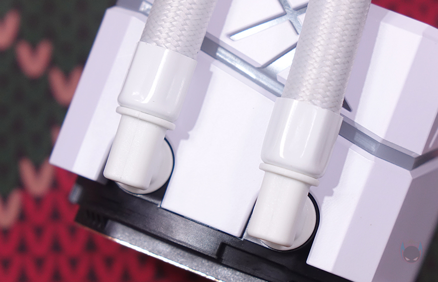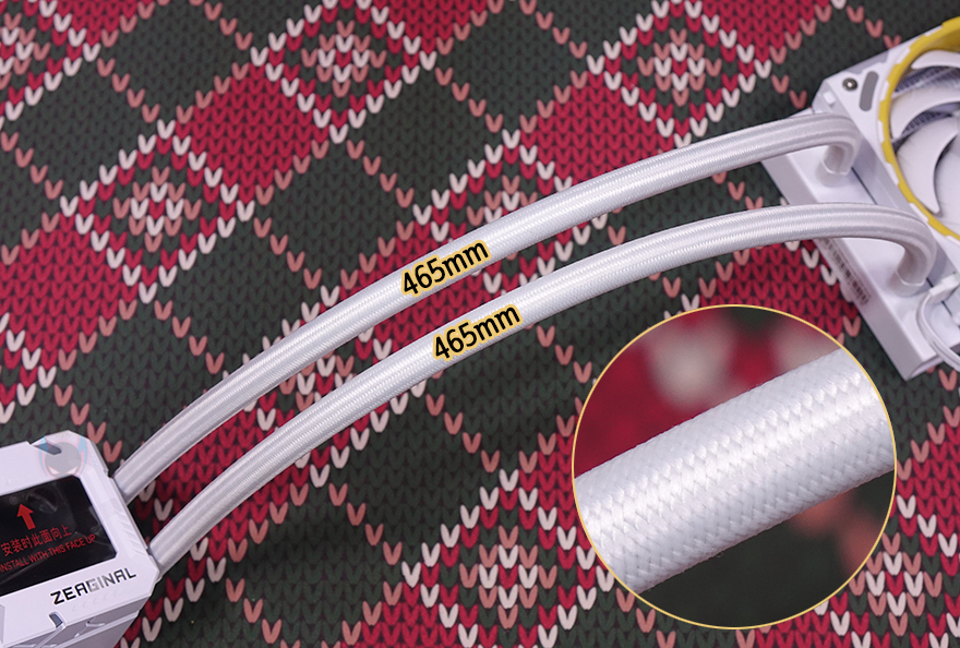 라디에이터(Radiator)와 워터블록(Water block)이 연결되는 튜브(Tube) 길이는 465mm이며, 튜브 훼손방지를 위해 전체 슬리빙처리가 적용되었으며, 양쪽 연결부 마감 역시 누수가 발생하지 않도록 깔끔하게 처리되어 있습니다. 물론, 워터블록 쪽 연결부는 회전이 가능하기 때문에 튜브 위치조절이 가능합니다.