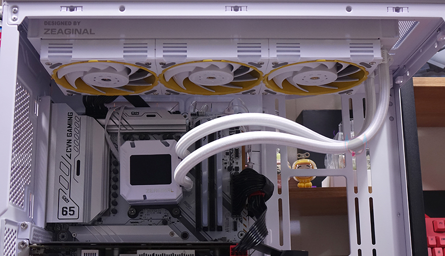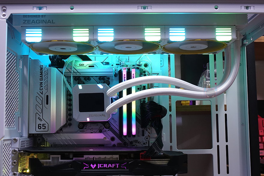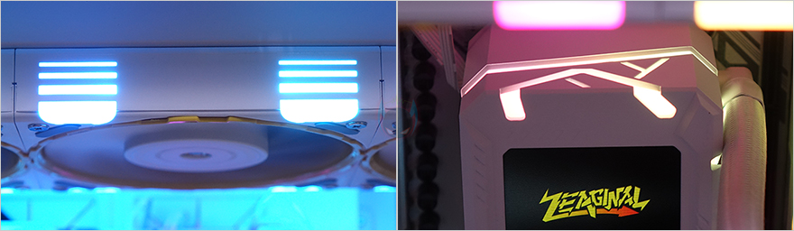 Yeston ZC-ZEUS XT 360 수랭쿨러 장착 후, PC 전원을 켜면 바로 앞서 언급했던 팬 측면과 워터블록 측면의 RGB 라이트닝효과(lightning effect)를 확인할 수 있습니다. 물론, 사용하는 메인보드에 5V ARGB 헤더가 있다면, 팬(Fan)과 워터블록(Water block)에 있는 ARGB 커넥터를 연결해서, 메인보드에서 제공하는 RGB Sync 프로그램과 함께 연동해서 다양한 라이트닝 모드로 사용할 수도 있죠.