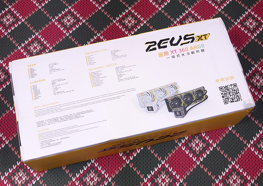 제품 패키지부터 살펴보면, 박스형 패키지로 박스 전체까지 비닐밀봉처리가 되어있어서 소비자입장에선 좀 더 판매제품에 신뢰를 가질 수 있습니다. 그리고, 박스 전면에는 제품명을 크게 표기해 놨으며, 아래에는 2.4인치 LCD 일체형 수랭쿨러라는 콘셉트 문구도 쉽게 확인할 수 있고, 위쪽에는 메인보드 RGB Sync 지원의 ARGB 표기도 확인할 수 있습니다. 박스후면에는 한쪽 아래에 제품 이미지를 확인할 수 있는데, 뒤에서 다시 언급하겠지만, ZC-ZEUS XT 360 수랭쿨러는 블랙(Black)과 화이트(White) 2가지 색상으로 출시되었습니다. 그리고, 바로 옆에는 제품의 기본 사양(Spec)으로 팬(Fan)과 쿨러(Cooler) 사양을 상세하게 표기해 놨죠.