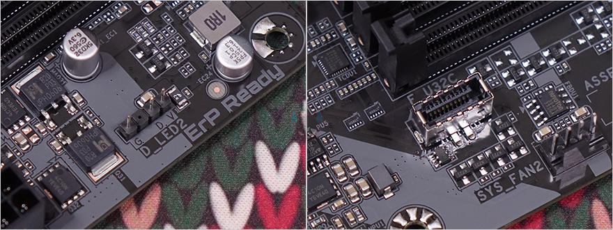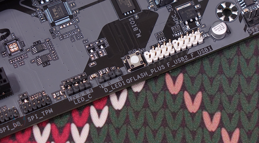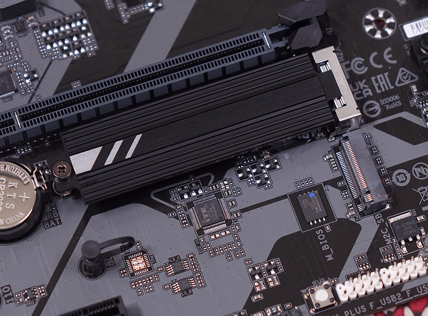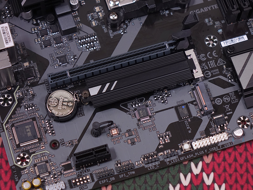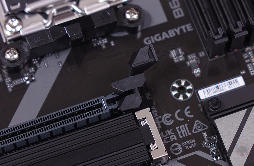 PCIE 슬롯은 2개 구성으로 16배속과 1배속으로 역시 B650M K 모델과 동일하지만, 약간의 차이가 있죠. B650M D3HP가 좀 더 저렴하기때문에 그래픽카드가 장착되는 1번 슬롯에 B650M K에 적용되던 스틸아머 디자인이 B650M D3HP에는 적용되어 있지 않습니다. 물론, 슬롯 내구성 강화를 위한 부분이라 실사용에선 크게 아쉬운 부분이 아니죠. 그리고, 바로 아래에는 2개의 M.2 SSD 슬롯이 배치되어 있는데, 이 부분은 B650M K와 동일하게 1번 M.2 SSD 슬롯에는 방열판이 적용되어 있고, 2번 M.2 SSD 슬롯은 푸시-핀 방식의 무나사 장착을 지원합니다. 물론, 방열판에는 써멀패드가 기본 부착되어 있죠. 그리고, 슬롯과 같은 위치에서 메인보드 맨 아래에는 추가로 5V ARGB 헤더가 1개 더 배치된 것을 확인할 수 있고, 바로 옆에는 12V RGB 헤더도 함께 배치되어 있죠.