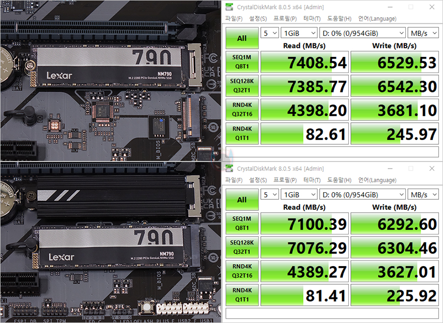 끝으로, B650M D3HP 메인보드에 적용된 2개의 M.2 SSD 슬롯 모두 B650M K 메인보드와 마찬가지로 PCIe 4.0 규격으로 최대 4 레인까지 지원합니다. 그래서, PCIe 4.0x4 규격의 SSD를 장착해서, 각 슬롯에서 SSD 성능 확인을 해보면, 규격상 나올 수 있는 최대 읽기 7000MB/s대와 최대 쓰기 6000MB/s대의 속도를 확인할 수 있습니다.