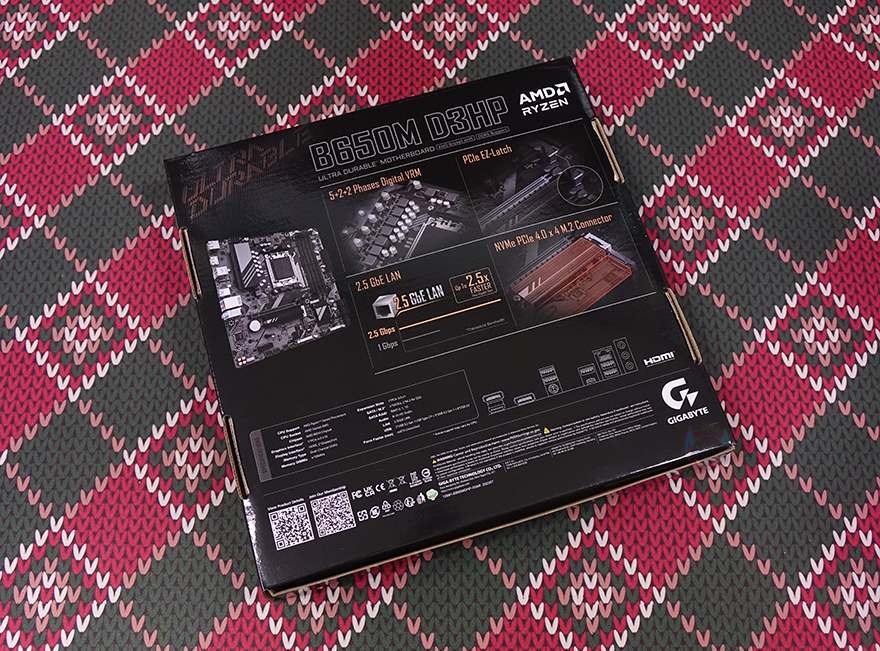 제품박스부터 살펴보면, B650M D3HP 메인보드 역시 기가바이트 메인보드의 기본 라인업이라 할 수 있는 UD시리즈에 제품군이고, 엔트리급 제품이기때문에 앞서 만난 B650M K와 마찬가지로 박스 디자인이 심플합니다. 전면에는 UD 시리즈 로고와 함께 모델명만 표기해 놨으며, B650 칩셋과 DDR5 지원, 국내 정식수입사인 (주)피씨디렉트의 무상 3년 보증기간을 추가로 함께 확인할 수 있죠. 그리고, 박스 후면에서 제품의 이미지를 확인할 수 있는데, 앞서 만난 바로 위에 상위 모델 B650M K와 거의 유사한 디자인임을 미리 알 수 있습니다. 또한, 후면에는 제품의 주요 특징과 제품의 기본 사양, 백패널 I/O 포트 표기를 추가로 확인할 수 있는데, 모두 뒤에서 다시 언급하겠습니다.