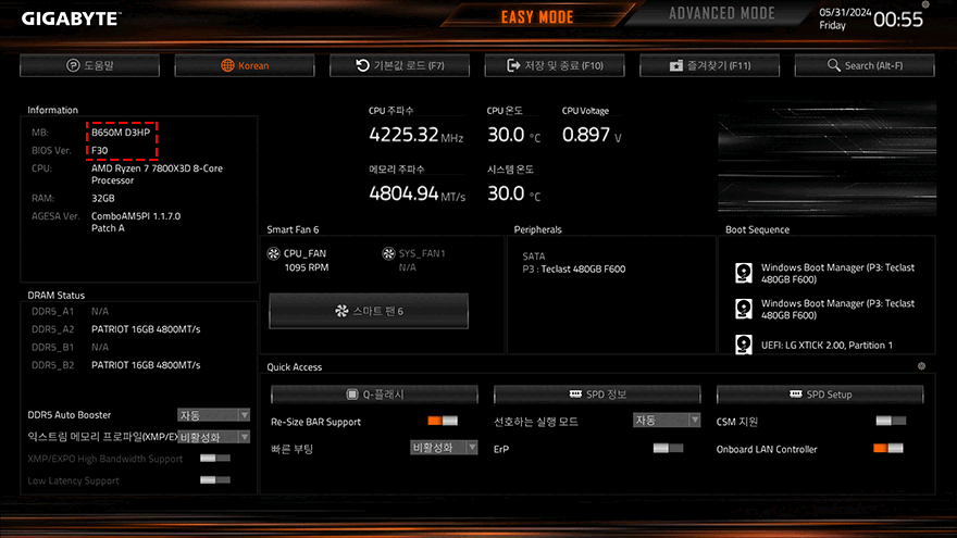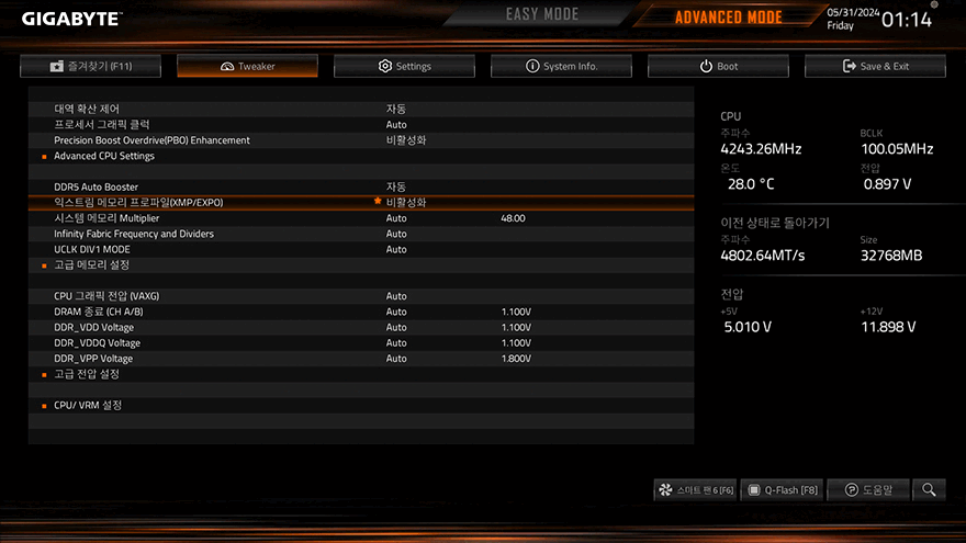 기가바이트 B650M D3HP 메인보드를 직접 사용해보면, 이미 여러 번 언급했듯이 B650M D3HP는 먼저 만났던 B650M K와 거의 유사한 모델입니다. 그래서, 바이오스 CMOS 메뉴도 동일하죠. F2키를 통해 Easy와 Advanced 모드로 전환할 수 있으며, B650칩셋 기반이기 때문에 CPU와 메모리 오버클럭을 위한 Tweaker 메뉴도 갖추고 있습니다. 특히, 바이오스 같은 경우에는 최신 버전이 다음 세대 즉 라이젠 9000 시리즈 지원까지 벌써 나왔기 때문에 최신 버전으로 업데이트해놓으면 좋습니다.
