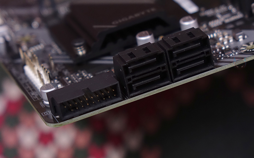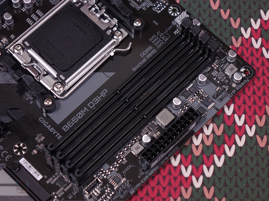 메모리 슬롯은 4개 구성으로 DDR5를 지원하며, 클럭은 7600MHz 이상 지원, 용량은 논-바이너리 메모리까지 지원해서 최대 192GB 용량을 갖출 수 있게 지원합니다. 메모리슬롯 주변으로는 B650M K와 마찬가지로 기가바이트 RGB Sync인 RGB Fusion 연동을 위한 5V ARGB 헤더가 1개 배치되어 있으며, USB 3.2 Gen1 타입 C 내부헤더가 배치되어 있죠. 그리고, 같은 위치에서 메인보드 오른쪽 맨 아래에는 4개의 SATA 커넥터와 USB 3.2 Gen1 타입 A 내부헤더가 배치되어 있는데, 모두 B650M K와 동일한 위치입니다.