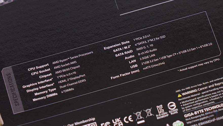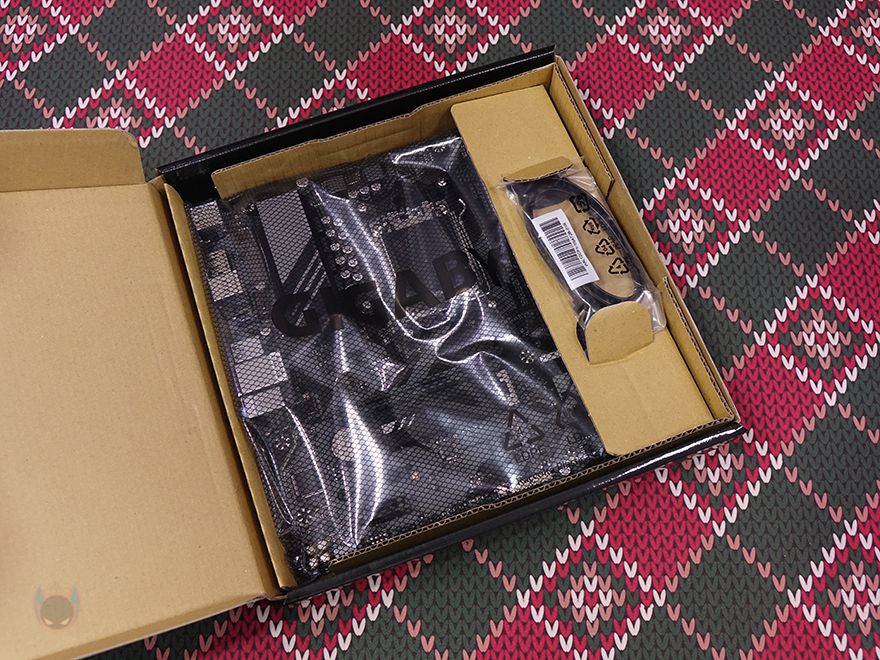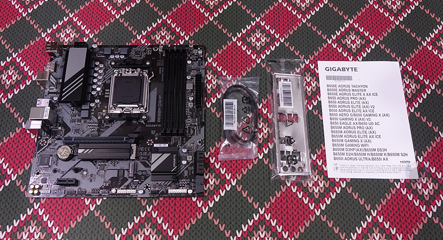 박스를 열어보면, 메인보드 기본 포장처리가 되어 있으며, 구성품은 B650M D3HP 메인보드, SATA 케이블 1개, 백패널 I/O 쉴드, 기본 설치가이드로 역시 구성품 차이는 B650M K와 차이가 없습니다.