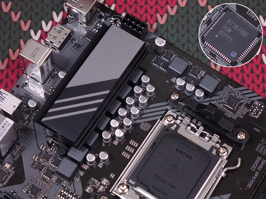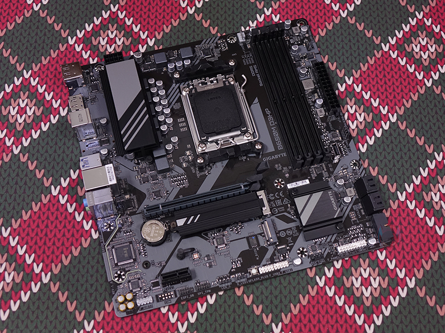 그럼, 본격적으로 기가바이트 B650M D3HP 메인보드 레이아웃을 살펴보면, M-ATX 폼 규격으로 전체적인 디자인은 앞서 언급했듯이 먼저 만났던 바로 위에 상위모델 B650M K와 유사합니다. 일단, CPU 주변에 배치된 전원부에 장착된 방열판 디자인도 동일한데, 사실 이 전원부에서 조금 차이를 두고 있죠. 앞서 만난 B650M K는 12-페이즈를 갖췄고, B650M D3HP는 이보다 3개가 적은 9 페이즈 전원부를 갖췄습니다. 물론, 전원부 컨트롤 칩셋은 디지털 방식으로 하이브리드 디지털 전원부죠. 그리고, 방열판 안쪽에는 써멀패드도 기본 부착되어 있습니다.