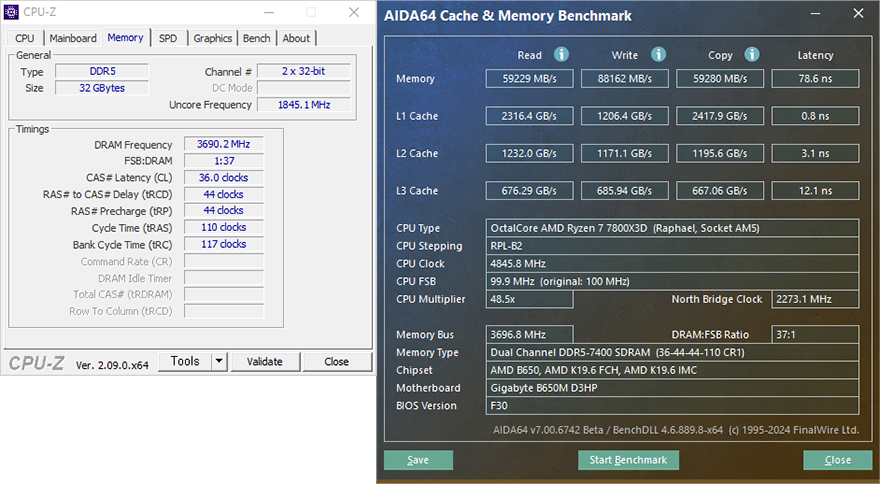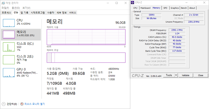메모리 지원은 앞서 언급했듯이 DDR5를 지원하는데, 클럭 같은 경우 7600 MHz이상 지원으로 실제 7400 MHz 고클럭이 적용된 XMP 프로파일을 장착해 CMOS에서 XMP 프로파일을 불러오는 것만으로 쉽게 메모리 오버클럭을 적용할 수 있게 지원해주고 있습니다. 또한, 용량 같은 경우에도 DDR5부터 등장하기 시작한 단일용량 24GB, 48GB 용량의 논바이너리 용량까지 지원하는데, 실제 48GB 단일용량의 메모리는 듀얼 채널로 구성했을 시 96GB로 완벽하게 작동되는 걸 확인할 수 있죠.