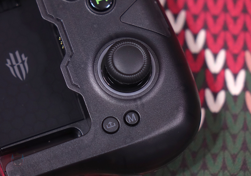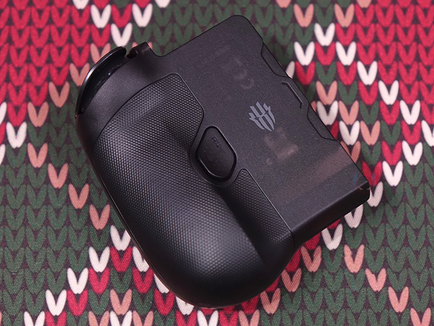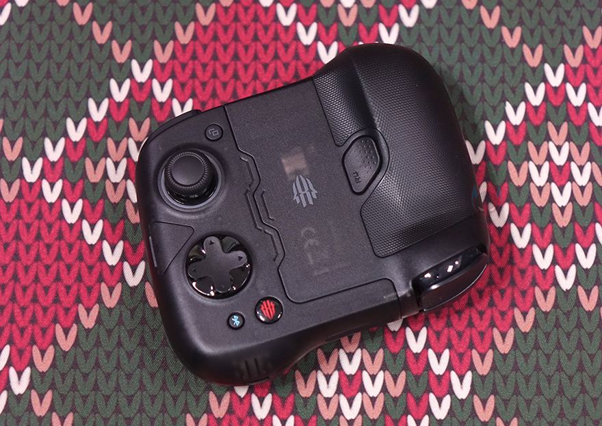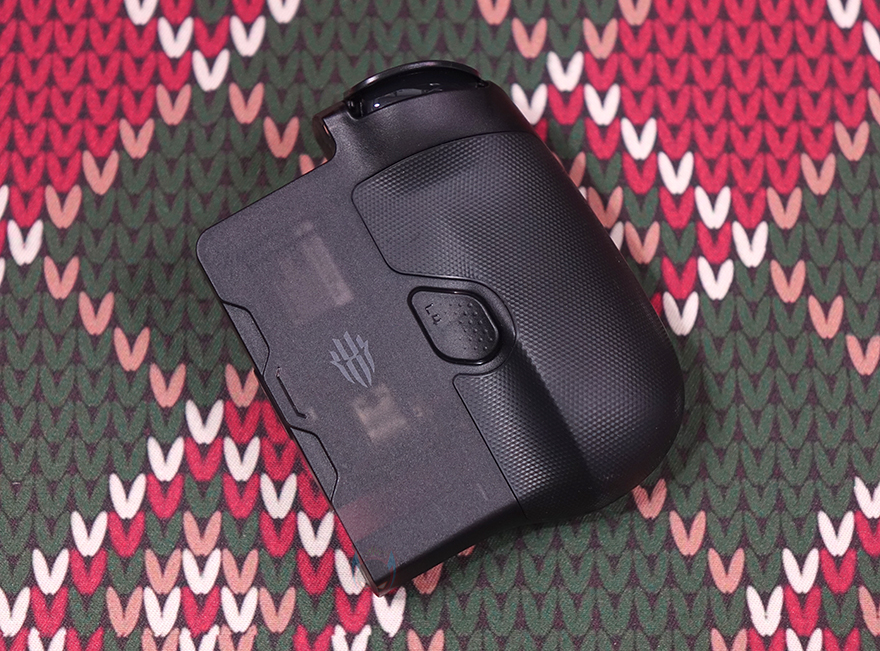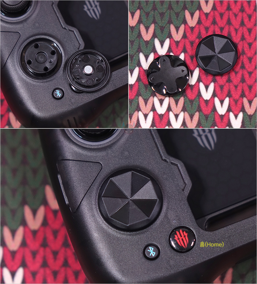 또한, 왼쪽 조이스틱 아래에는 D-Pad가 배치되어 있는데, D-Pad 역시 분리형으로 자석방식(Magnetic)이라 쉽게 분리가 되며, 교체용은 다각형 방향키(Polygonal arrow keys) 패드입니다. 그리고, 패드 아래에는 블루투스 표시의 페어링 버튼과 같은 위치 바로 오른쪽에 홈(Home) 버튼이 배치되어 있습니다. 그리고, 패드 앞부분에는 트리거 버튼(LB/LT)이 배치되어 있으며, 패드 아래쪽에는 USB 충전케이블과 연결되는 USB Type-C 포트가 배치되어 있죠. 패드 후면에는 왼쪽 백버튼(L4)이 배치되어 있으며, 그립감을 위해 후면에 부드러운 고무 재질로 마감처리된 것을 확인할 수 있습니다.