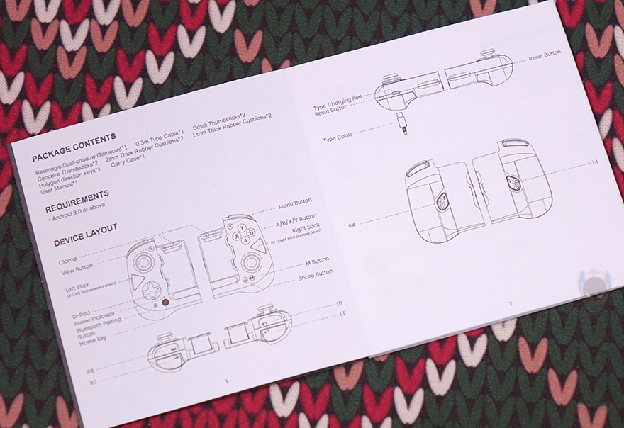 그리고, 박스 후면에는 제품 이미지와 함께 부위별로 명칭을 표기하고 있는데, 왼쪽 패드와 오른쪽 패드로 각각 나뉘어진 형태라는 걸 미리 알 수 있습니다. 명칭들은 흔히 모바일용 게임패드에서 볼 수 있는 이름들이라 익숙하며, 박스를 열어보면, 비닐포장과 함께 전용 파우치 제공과 부속품이 담긴 별도의 납작한 박스를 확인할 수 있죠. 보관 시 사용되는 전용 파우치 안에는 Double Blade(더블 블레이드) 게임패드와 함께 교체용 조이스틱과 D-Pad를 확인할 수 있으며, 별도의 박스 안에는 제품설명서, USB 충전케이블, 고무 재질의 1mm 쿠션 패드와 2mm 쿠션 패드가 제공됩니다. 물론, 제품설명서에는 좀 더 자세한 설명을 담고 있기 때문에 사용 전에 참고하면 좋습니다.