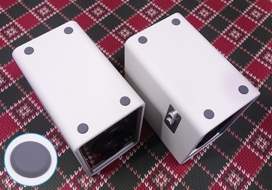 그리고, QR65 스피커의 또 하나의 특징은 바로 마감처리인데, 기본적으로 MDF 인클로저(MDF enclosure)를 적용하는 동시에 표면 마감을 가죽질감(leather texture)으로 한번 더 처리했습니다. 그래서, 스피커의 고급스러움을 살렸죠. 또한, 오른쪽(Right) 스피커의 오른쪽 측면(Side)에는 전원 버튼과 노브(Knob)가 배치되어 있는데, 전원 버튼은 한 번씩 누를때마다 연결모드를 변경할 수 있으며, 바로 위에 LED 인디케이터를 통해 연결모드를 표시해줍니다. 그리고, 아래 노브 2개는 각각 볼륨조절(Volume control)과 라이트효과 밝기조절(Brightness control) 기능인데, 이건 노브를 돌렸을 때 기능이고, 버튼식으로 누르는 기능도 있으며, 이부분은 뒤에서 다시 언급하겠습니다. 그리고, 오른쪽 스피커 왼쪽 측면(Left side)에는 다시 한 번 EDIFIER의 슬로건 'A Passion for Sound' 문구를 알루미늄판에 새겨 장착해 놨죠. 또한, 스피커 밑바닥 부분에는 모서리 부근으로 미끄럼방지 및 방진패드를 기본 부착해 놨습니다.