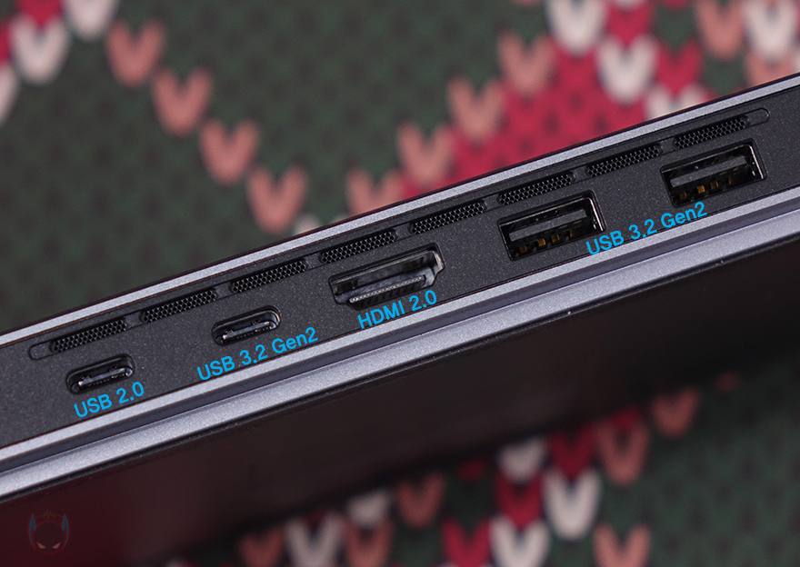 후면에는 각 종 포트와 방금 언급했던 쿨링 구조의 공기유입대로 후면 포트 위에 메쉬(Mesh) 디자인이 적용된 것을 확인할 수 있습니다. 포트에는 왼쪽부터 USB Type-C 포트 2개, HDMI, USB Type-A 포트 2개순으로 배치되어 있는데, Type-C 포트는 각각 USB 2.0과 USB 3.2 Gen2 규격이며, USB 2.0 포트가 전원케이블과 연결됩니다. 뒤에서 확인하겠지만, 포트 확장 장치인 마인드 독(Mind Dock)을 사용하면 USB 2.0 포트는 USB 3.2 Gen2와 마찬가지 일반 포트로 활용할 수 있죠. 그리고, 마인드 미니 PC 밑바닥에는 미끄럼방지 및 진동소음 최소화를 위한 패드가 기본 부착되어 있으며, 중앙에는 모델명을 새겨놨는데, 역시 한국어로 표기해 놨으며, 오른쪽에 작은 홈 부분을 누르면 커버처럼 분리할 수 있습니다. 자석(Magnetic) 방식이라 쉽게 분리가 되고, 분리를 하면 내부에 SSD 용량을 늘릴 수 있게 추가 공간이 있는데, 2230 사이즈(size)를 장착할 수 있죠. 참고로, 최대 1TB 용량까지 장착할 수 있습니다.