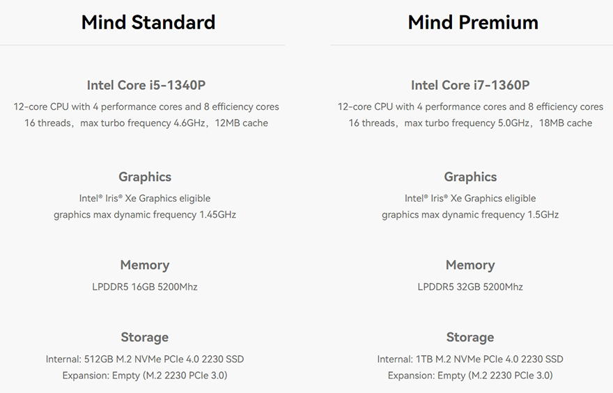 박스 후면에는 해당 제품 미니PC의 하드웨어 사양 표기를 확인할 수 있는데, 마인드(Mind) 미니 PC는 기본형(Standard)과 고급형(Premium) 2가지 사양으로 출시되었습니다. 두 사양 모두 인텔 13세대(Intel 13th) 모바일 CPU가 탑재되었는데, 기본형은 i5(1340P) 등급, 고급형은 i7(1360P) 등급이 탑재되었으며, 등급에 따라 램(RAM)과 SSD 용량도 차이를 두고 있습니다. 물론, CPU 등급 차이가 있기 때문에 CPU에 내장된 인텔 Xe 그래픽도 약간의 차이가 있죠. CPU와 램, SSD를 제외하면 나머지 하드웨어 구성 지원은 모두 동일합니다. 그리고, 또 하나 눈에 띄는 점은 국내 전자제품 안전(KC) 인증 표기를 확인할 수 있는데, 최근 이슈가 되었던 해외직구 정책에서도 걱정 없이 자유롭게 구입할 수 있고, 뒤에서 확인하겠지만 기본적으로 운영체제도 윈도우11 홈(Windows 11 Home)으로 사전설치되어 있죠.
