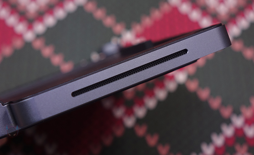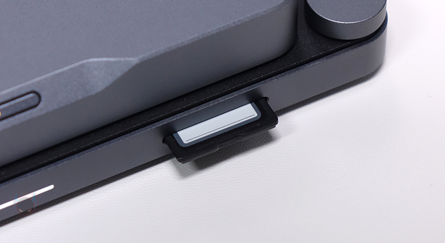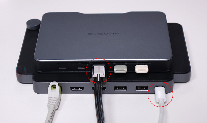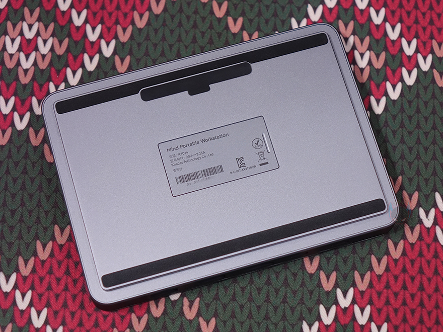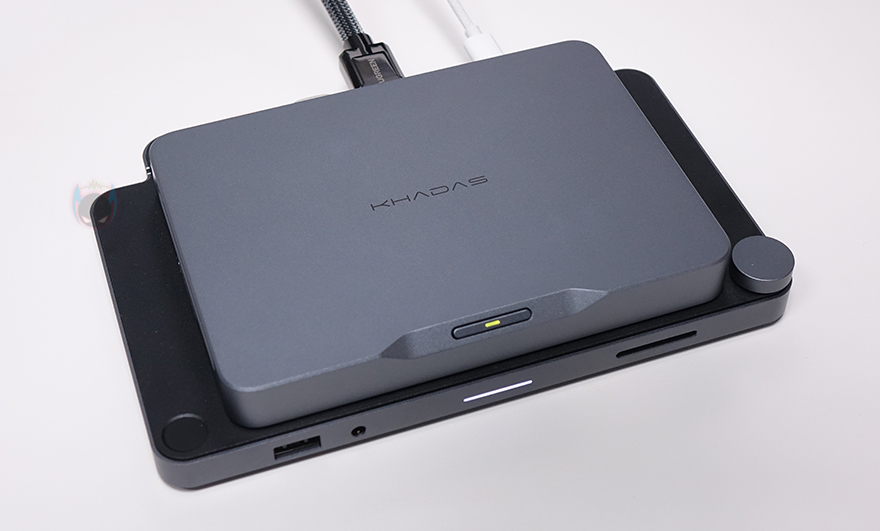 마인드 독(Mind Dock)을 좀 더 자세히 살펴보면, 상단에는 마인드 미니PC처럼 중앙에 Khadas 로고를 새겨놨으며, 마인드 미니 PC 크기만큼 약간 안으로 오목하게 처리된 모양을 확인할 수 있는데, 앞부분에 역시 고무 커버가 적용되어 있고, 커버를 벗이면, 슬롯을 확인할 수 있습니다. 바로, 마인드 독 상단 슬롯에 맞춰, 앞서 확인한 마인드 미니 PC 밑바닥의 슬롯과 결합되는 형태죠. 뒤에서 다시 확인하겠지만, 마인드 미니 PC에는 대기 배터리가 내장되어 있기 때문에, 마인드 독에 장착 사용하다가 분리해서 마인드 미니 PC에 전원만 다시 연결하면 바로 사용할 수 있습니다.