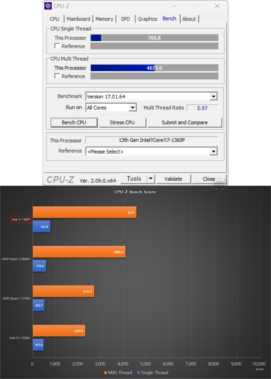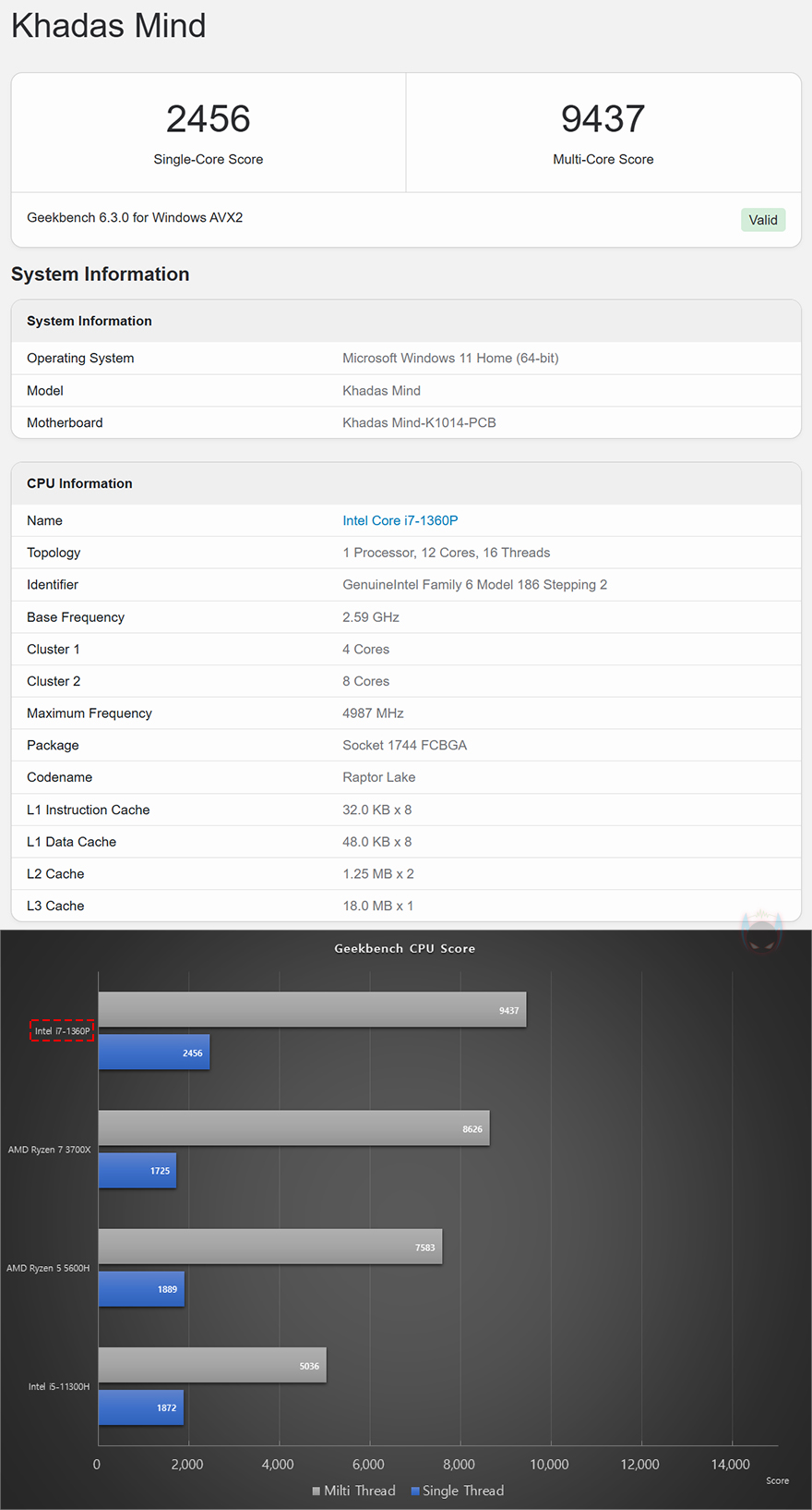 이제 마인드(Mind) 미니 PC의 사양을 확인해보는데, 앞서 언급했듯이 운영체제(OS)는 윈도우 11 Home이 사전 설치되어 있습니다. 또한, CPU 역시 앞서 언급한대로 기본형(Standard)과 고급형(Premium) 옵션에 따라 차이가 있는데, 리뷰에선 고급형 모델로 인텔 13세대 i7-1360P CPU가 탑재되었으며, 12코어(Cores)/16쓰레드(Threads) 구조입니다. 그리고, 메모리는 DDR5 규격으로 정확히는 저전력의 LDDR5이며, 클럭은 5200MHz입니다. 그래픽은 CPU의 내장그래픽으로 인텔 아이리스 Xe(Intel Iris Xe)죠. 그래서, 일단 CPU 성능부터 확인을 해보면, 인텔 i7-1360P 같은경우 가장 많은 코어와 쓰레드 구조를 가졌고, 부스트클럭도 최대 5.0GHz까지 도달하기때문에 비교대상 CPU들 중에서는 CPU-Z Bench, Geekbench, Passmark PerformanceTest CPU Mark, Cinebench R23 벤치마크 프로그램 모두에서 가장 좋은 점수를 보여줍니다. 물론, 고성능 수준은 아니지만, 게임을 제외한 편집작업 등의 용도로는 충분히 소화할 수 있는 성능이죠. 마인드 미니PC의 크기를 고려하면 시작에서 언급했듯이 휴대성이 강조되는 크기대비 성능은 만족스러운 수준이라 할 수 있습니다.