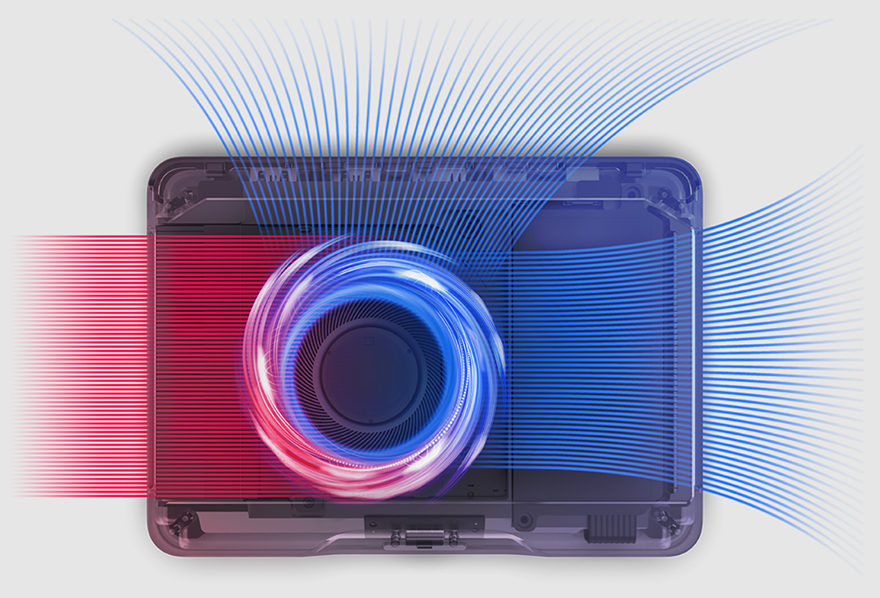마인드 미니PC(Mind mini PC)를 좀 더 자세히 살펴보면, 상단에는 심플하게 Khadas 로고를 새겨놨으며, 상단과 전면이 만나는 모서리 라인 중간에는 전원버튼(Power button)이 배치되어 있는데, 버튼 중아에는 작동상태를 확인할 수 있는 LED 램프(Lamp)가 적용되어 있습니다. 참고로, 버튼을 3초 이상 누르고 있으면 종료 메시지가 나오고, 8초 이상 누르고 있으면 강제 종료할 수 있습니다. 그리고, 양쪽 측면에는 내부에서 발생하는 발열을 배출할 수 있도록 에어홀 처리가 되었는데, 내부에 장착된 방열핀 일부도 볼 수 있습니다. 참고로, 마인드 미니 PC 내부에는 히트싱크 방열핀과 함께 블로우 팬이 장착되어 있으며, 증기챔버 액체 쿨링(VC(Vapor Chamber) liquid cooling) 기술로 적용되어 있습니다. 공기유입은 오른쪽 측면과 후면에서 이루어지고 배출은 왼쪽 측면으로 나가죠.