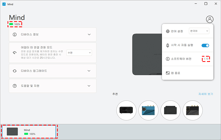 또한, 마인드 미니 PC(Mind mini PC)에는 전용 관리 앱(App)인 마인드 앱(Mind App)을 제공해주고 있는데, 운영체제 사전설치와 함께 자동 설치되어 있으며, 필요한 경우에는 홈페이지에서 다운로드(https://dl.khadas.com/products/mind/app/mind-app-install-v1.10.exe) 받을 수 있습니다. 일단, 기본 설치된 앱으로 살펴보면, 마인드 미니 PC의 디바이스 정보를 비롯해, 대기 배터리를 절전모드로 사용할지, 해제해서 사용할지 선택할 수 있는데, 해제하면 일반사용은 20분 정도밖에 사용하지 못하기 때문에 절전모드를 유지하는 걸 권장합니다. 이 밖에 디바이스 업그레이드로 EC와 바이오스(BIOS) 업데이트로 앱에서 손쉽게 진행할 수 있으며, 마인드 독(Mind Dock)과 연결되면 자동으로 앱에서도 인식되어 마인드 독의 디바이스 정보와 업그레이드도 진행할 수 있습니다. 마인드 미니 PC를 사용한다면, 마인드 앱을 꼭 함께 사용하길 추천합니다. 참고로, 마인드 앱 최신 버전으로 업데이트하면 대기 배터리 잔량을 확인할 수 있으며, 최신 EC 업데이트를 위해서는 최신 버전으로 업데이트해야 합니다.