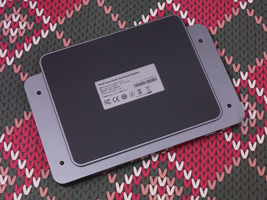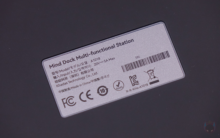 그리고, 마인드 독 양쪽에는 각각 지문인식(Fingerprint Scanner)과 볼륨조절 노브(Volume control knob)가 배치되어 있으며, 전면에는 왼쪽에 USB 3.2 Gen1 포트와 3.5mm 오디오 잭 포트가 배치되어 있고, 오른쪽에는 SD 카드 슬롯이 적용되어 있죠. 마인드 독 역시 양쪽 측면에는 내부 발열이 배출되도록 메쉬 디자인이 적용되어 있으며, 후면에는 확장 포트로 기가비트 지원의 랜(LAN), HDMI 포트 2개, USB 3.2 Gen1 포트 2개, USB Type-C 포트가 배치되어 있습니다. 물론, USB Type-C 포트가 전원 포트가 되겠으며, 전원어댑터와 케이블은 마인드 미니 PC에 제공되는 제품을 그대로 사용하면 됩니다. 그리고, 마인드 독 밑바닥에는 널찍하게 패드가 부착되어 있으며, 중앙에 역시 한글 표기로 모델명과 최대 전기 입력값, 그리고 KC인증을 다시 확인할 수 있습니다.