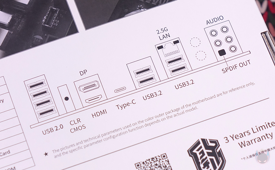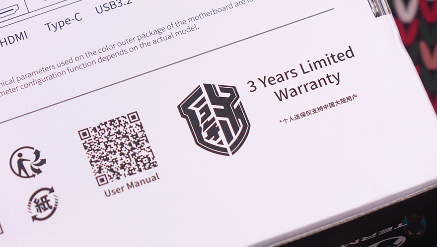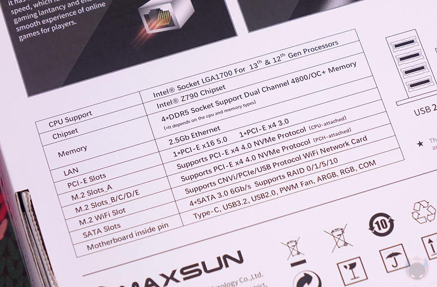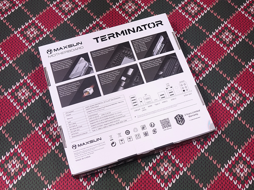 박스 후면에는 제품의 주요 특징을 언급하고 있는데, 전원부의 방열판(Heatsink), 디지털 전원부, 5개의 M.2 SSD 슬롯, 2.5GbE 랜(LAN) 포트, 전면 USB 3.2 Gen2x2 포트 헤더, DDR5 지원 램(RAM) 슬롯 내용을 담고 있습니다. 그리고, 아래에는 왼쪽에 제품의 기본 사양표기와 오른쪽에는 백패널 I/O 포트 표기를 해놨죠. 그리고, MAXSUN 역시 글로벌시장을 고려해 이미 다른 경쟁업체들과 마찬가지로 친환경정책으로 설명서(Manual)는 QR코드로 제공되며, 3년 보증기간도 지원하고 있습니다.