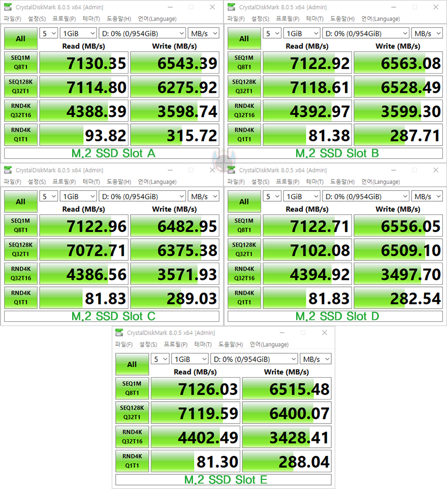 이번엔 M.2 SSD의 성능을 확인해 보는데, TERMINATOR Z790M D5 ICE 메인보드는 총 5개의 NVMe SSD를 장착할 수 있고, 5개의 슬롯 모두 PCIe 4.0x4 규격을 지원합니다. 그래서, PCIe 4.0x4 규격의 NVMe SSD를 장착해서 5개의 슬롯 모두 CrystalDiskMark를 통해 속도 성능을 확인해 본 결과, PCIe 4.0x4 규격의 최대 읽기 속도와 최대 쓰기 속도 수준의 성능을 보여주는 걸 확인할 수 있었습니다. 개인적으로 저장장치를 많이 필요로 하는 소비자에겐 만족스러운 부분이라 생각됩니다.