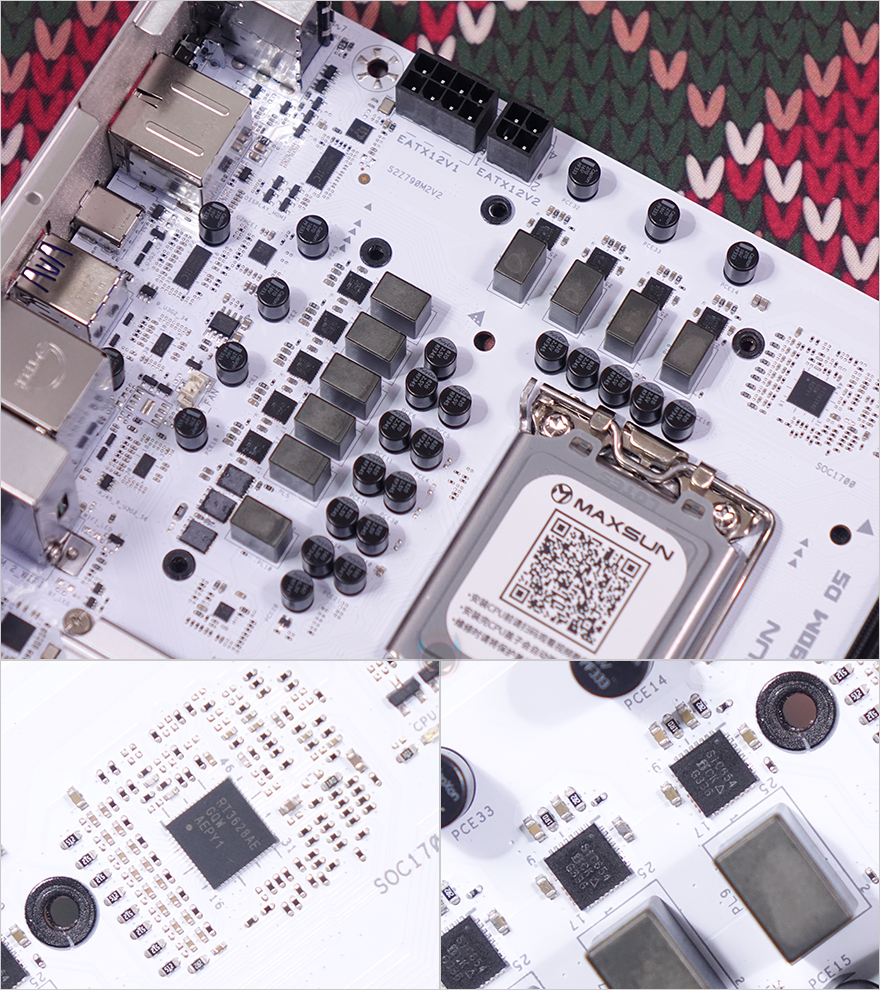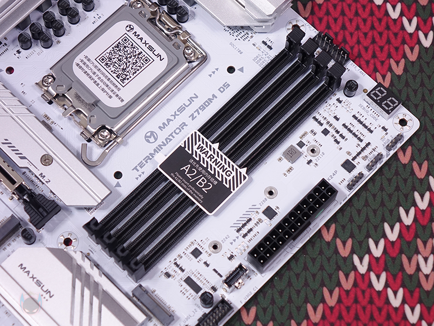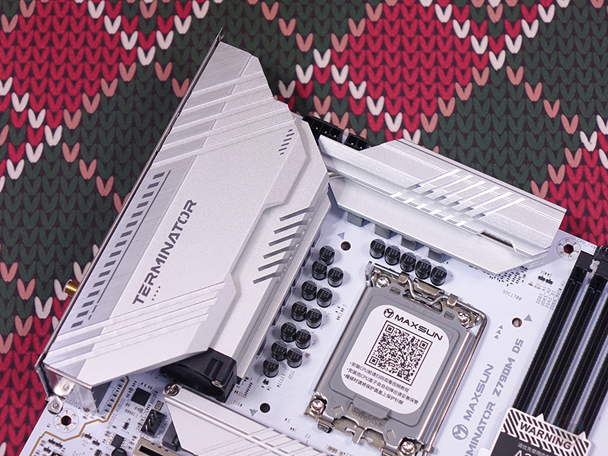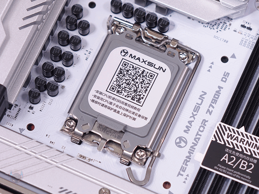 그럼, 본격적으로 MAXSUN(맥선)의 TERMINATOR Z790M D5 ICE 메인보드를 살펴보는데, M-ATX 폼 규격으로 앞서 잠깐 언급했듯이 TERMINATOR Z790M D5 ICE는 화이트(White) 버전 모델입니다. 그래서, PCB기판 색상이 화이트로 적용되어있죠. 먼저 출시했던 TERMINATOR Z790M D5와 비교해 보면 쉽게 차이점을 알 수 있습니다. 그리고, 뒤에서 확인하겠지만, 먼저 출시한 TERMINATOR Z790M D5는 Wi-Fi 모듈 적용 유무에 따라서 제품이 나뉘었는데, TERMINATOR Z790M D5 ICE는 기본적으로 Wi-Fi 모듈이 탑재되어서 나왔죠. 좀 더 자세히 살펴보면, CPU 소켓 부분에는 커버와 함께 QR코드가 표시되어 있는데, 해당 QR코드로 접속하면 CPU 장착 가이드 영상을 볼 수 있습니다. 그리고, 인텔 Z790칩셋 기반으로 소켓 규격은 LGA 1700이고, 인텔 12~14세대 CPU까지 지원합니다.