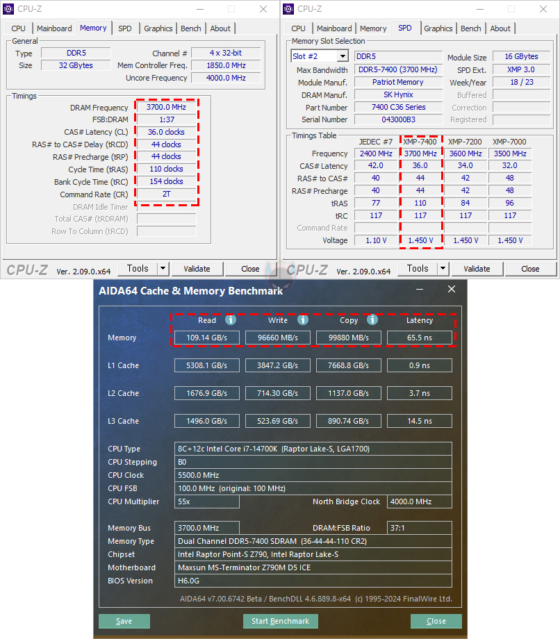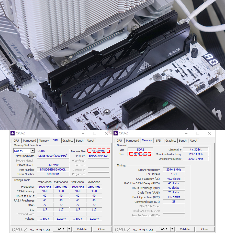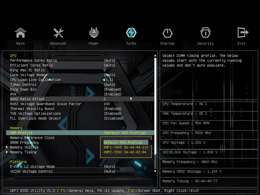 그럼, 이제 일부 기능들을 살펴보는데, 일단 Z790칩셋 기반이기 때문에 CPU와 메모리(RAM) 오버클럭 지원을 합니다. 하지만, CPU 같은 경우 최근 이슈가 있기 때문에 사실상 오버클럭에 대한 매리트가 사라져 버려서 메모리(RAM) 오버클럭에 대해서만 살펴보는데, 앞서 언급했듯이 TERMINATOR Z790M D5 ICE 메인보드는 DDR5 지원에 클럭은 7600MHz이상을 지원합니다. 따라서, 고 클럭이 적용된 XMP 프로파일이라면 쉽게 오버클럭으로 사용할 수 있는데, 실제 CMOS 메뉴에 터보(Turbo) 메뉴로 들어가 XMP 프로파일값을 불러오면 한 번에 설정값이 적용되어 작동되는 걸 확인할 수 있습니다. 또한, DDR5 메모리부터 생기기 시작한 단일용량의 24GB, 48GB 논-바이너리(non-binary) 메모리도 잘 적용되는 걸 확인할 수 있죠.
