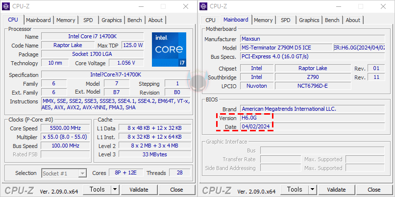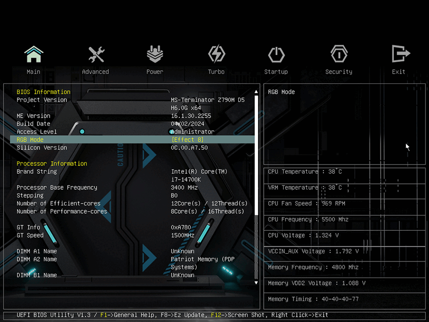 직접, MAXSUN(맥선) TERMINATOR Z790M D5 ICE 메인보드를 사용해 보면, 일단 바이오스(BIOS) CMOS 메뉴를 잠깐 살펴보는데 메뉴는 크게 메인(Main), 고급(Advanced), 파워(Power), 터보(Turbo), 스타트업(Startup), 보안(Security), 종료(Exit) 6가지입니다. 흔히 메인보드에서 보는 메뉴와 조금 명칭이 다를 뿐, 설정 부분들은 비슷합니다. 고급(Advanced) 메뉴는 흔히 말하는 칩셋(Chipset) 관련 메뉴이고, 파워(Power)는 전력관리 메뉴, 터보(Turbo)는 CPU와 메모리 오버클럭 관련 메뉴, 스타트업(Startup)은 부트(Boot) 메뉴를 말하죠. 그래서, CPU와 메모리 오버클럭을 다룰 때는 터보와 파워 메뉴에서 하면 되고, 바이오스 업데이트 같은 경우에는 종료(Exit) 메뉴에서 Ez Update를 통해 진행할 수 있습니다. 참고로, TERMINATOR Z790M D5 ICE 메인보드의 최신 바이오스는 2024년 4월 22일 자입니다.