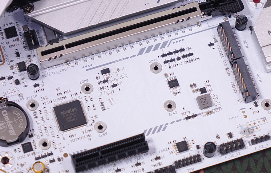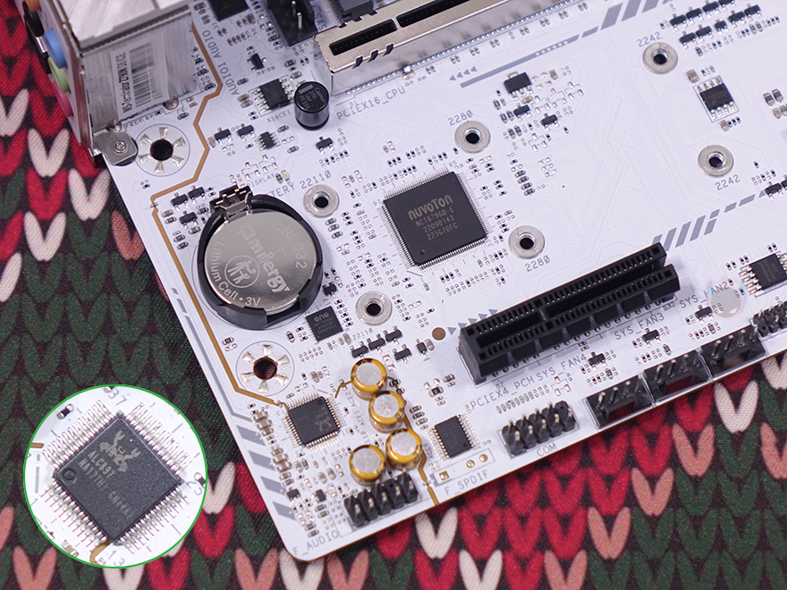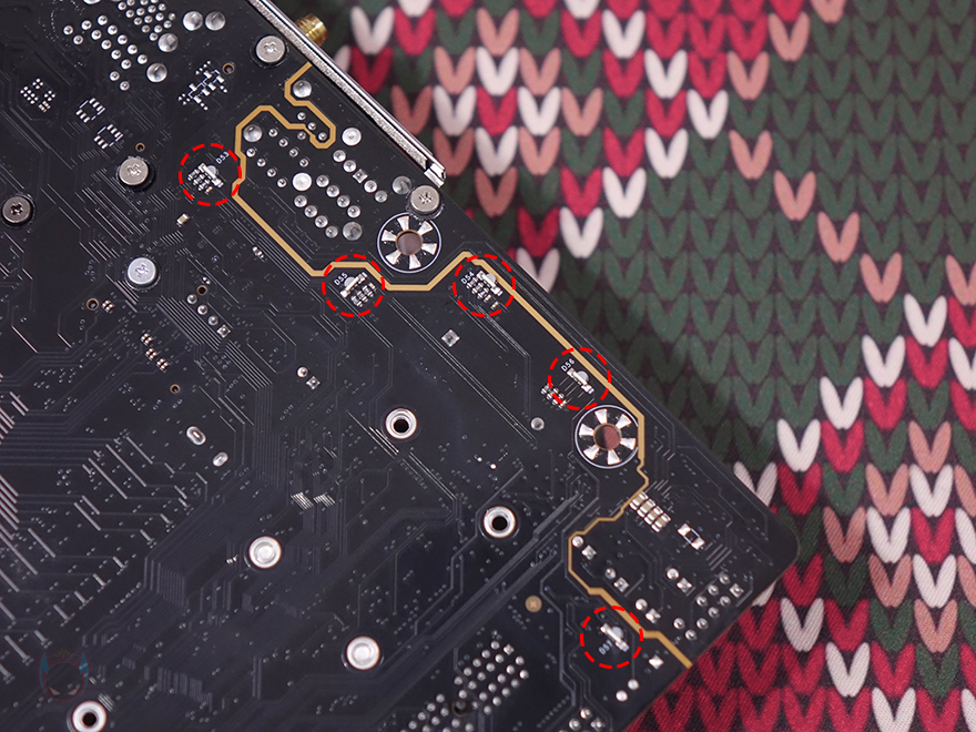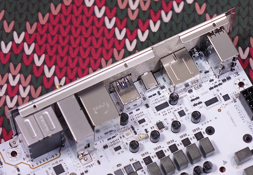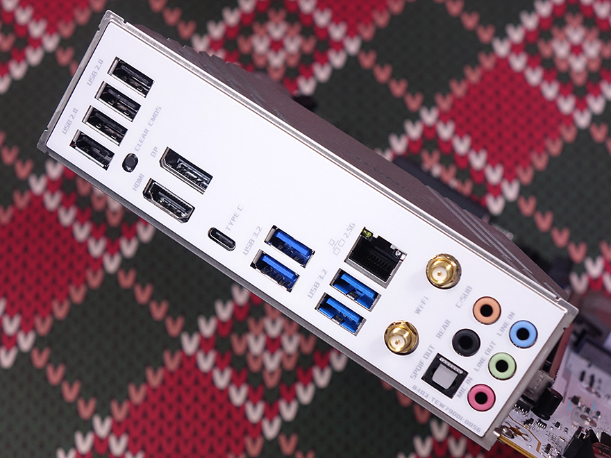 PCIE 슬롯 기준 맨 왼쪽에는 내장 오디오(Onboard Audio) 위치로 독립 PCB구간으로 처리했으며, 오디오 칩셋은 Realtek사 칩셋을 사용했습니다. 그리고, 주변에 3개의 FAN 커넥터도 확인할 수 있죠. 참고로, 같은 위치에 메인보드 후면에는 RGB 라이트효과를 볼 수 있게 LED를 적용해 놨습니다. 끝으로, 백패널 I/O 포트 부분에는 기본 백패널 I/O 실드가 장착되어 있으며, 포트(Port) 구성에는 USB 2.0 포트 4개, CMOS 클리어 버튼(Clear button), HDMI와 DP 모니터 출력포트, USB 3.2 Gen2x2 Type-C 포트, USB 3.2 Gen1 Type-A 포트 4개, 2.5GbE 랜(LAN) 포트, Wi-Fi 모듈 안테나 커넥터, 오디오와 광 S/PDIF 출력포트가 배치된 것을 확인할 수 있습니다. Wi-Fi 규격은 Wi-Fi 6E이며, 제공되는 Wi-Fi 안테나는 각도조절이 가능합니다.